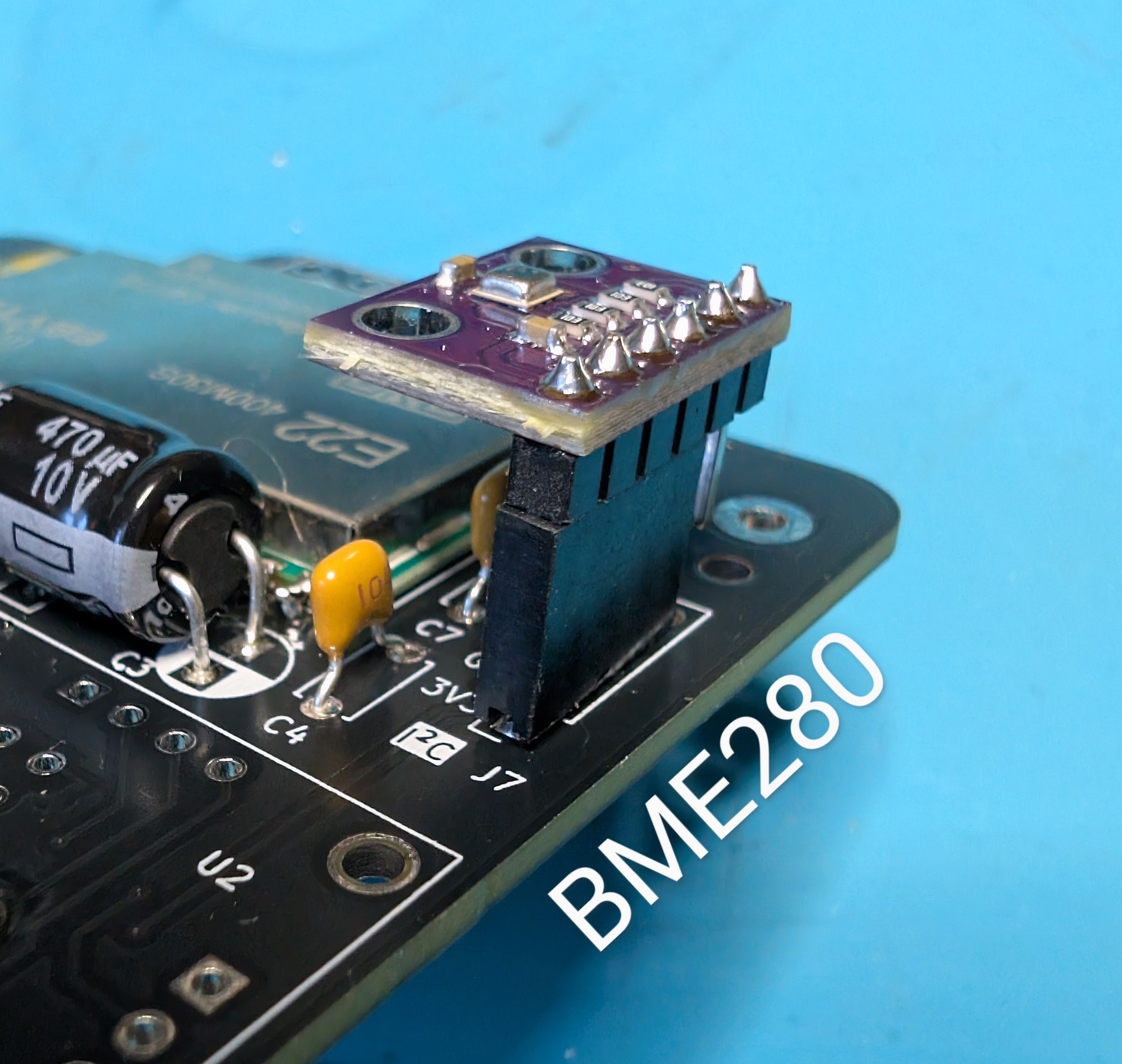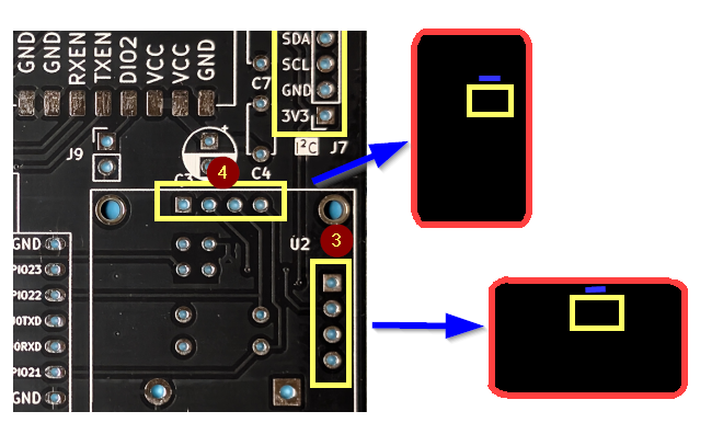 Ausserdem hat das Board 6 Pins und wir haben nur 4 Pins auf der Platine. Du kannst also den Pin-Header um zwei Pins kürzen. Für das Aufstecken auf der Platine brauchst du einen der 4-Pin-Buchsenleisten. (J7) bitte vom unteren 3v3 Punkt aus nach oben befüllen. Der obere 3v3 Anschluss bleibt leer. Vergleiche die Beschriftung auf dem BME-Board mit der auf der Platine.