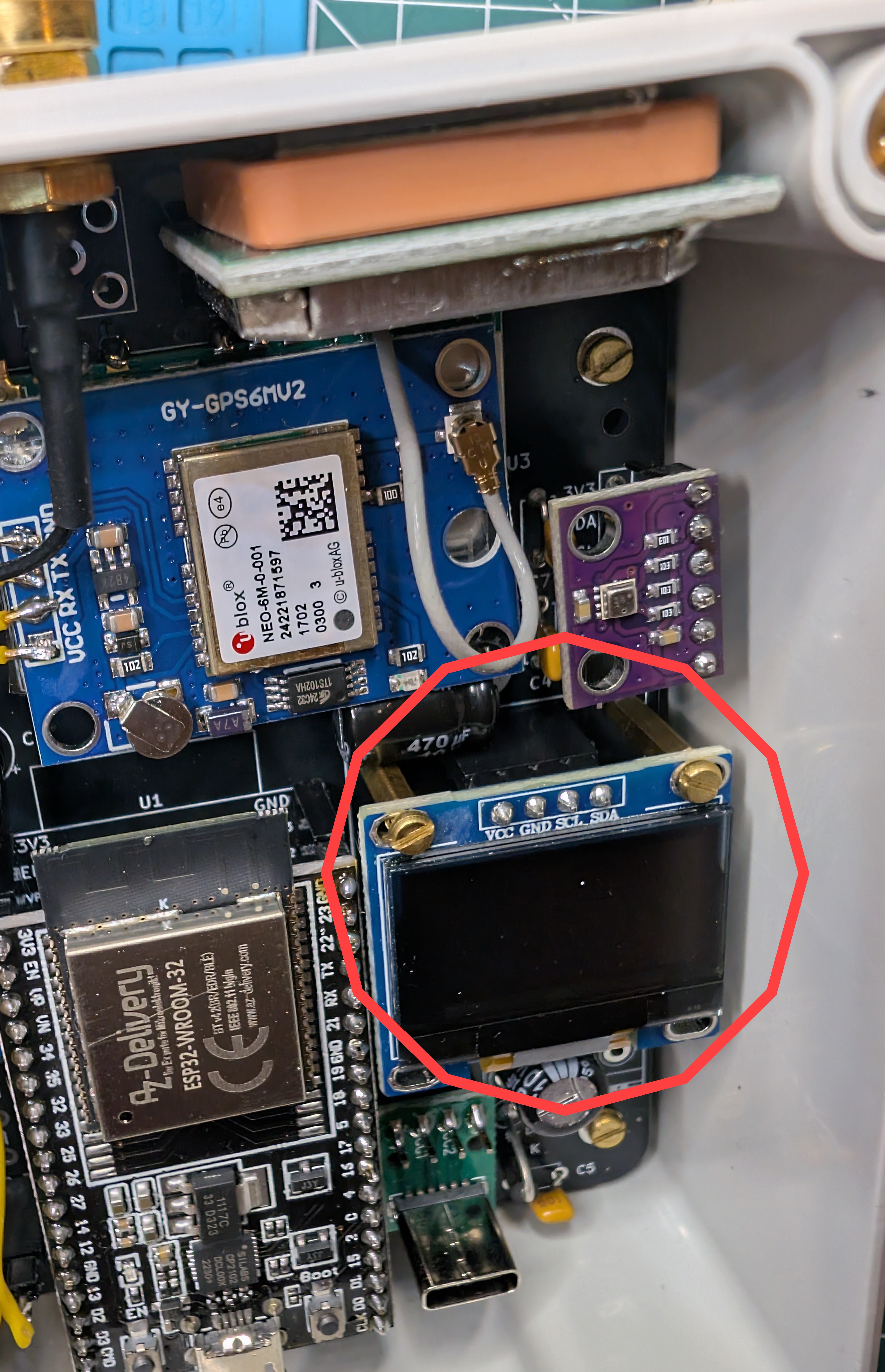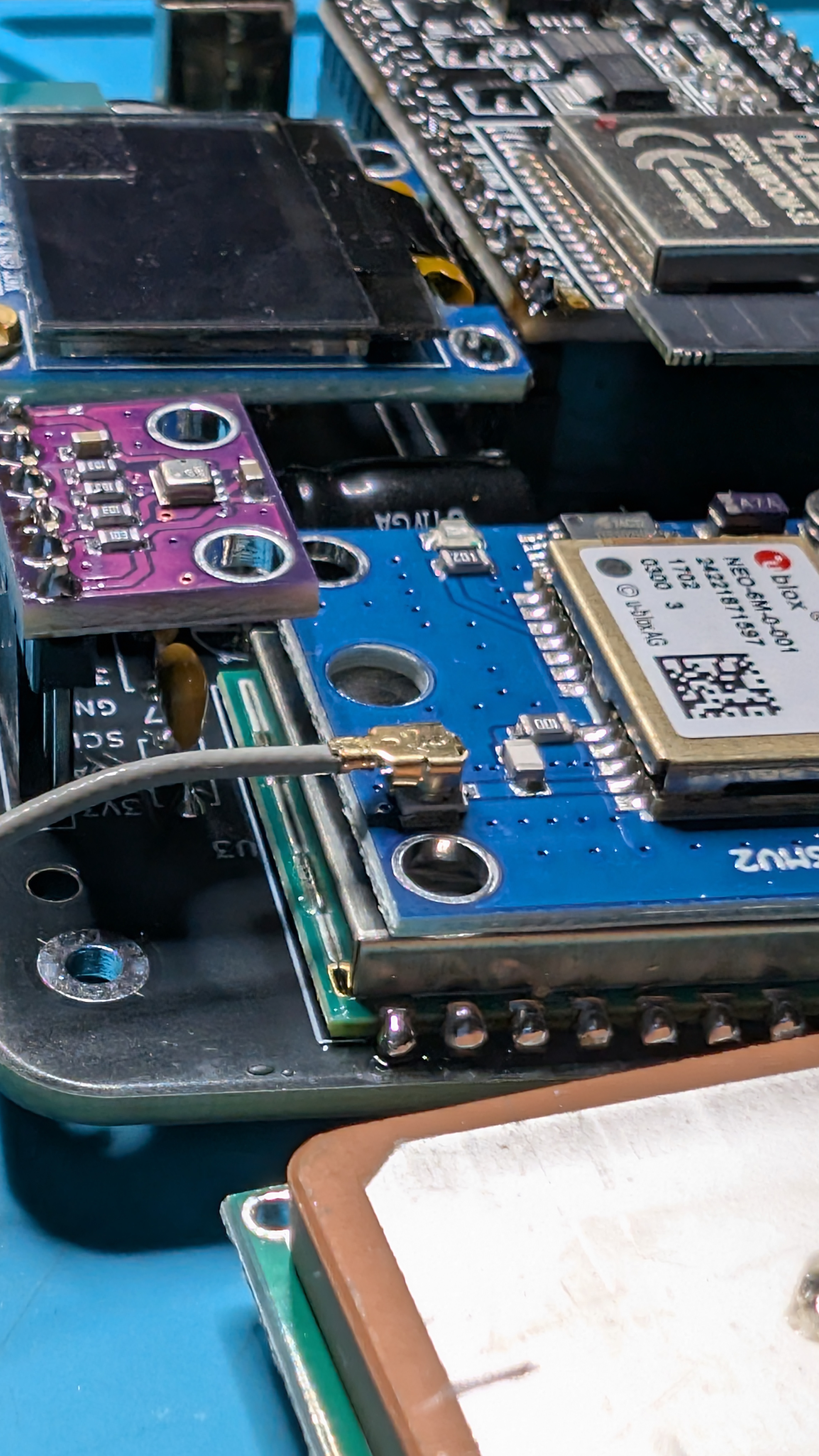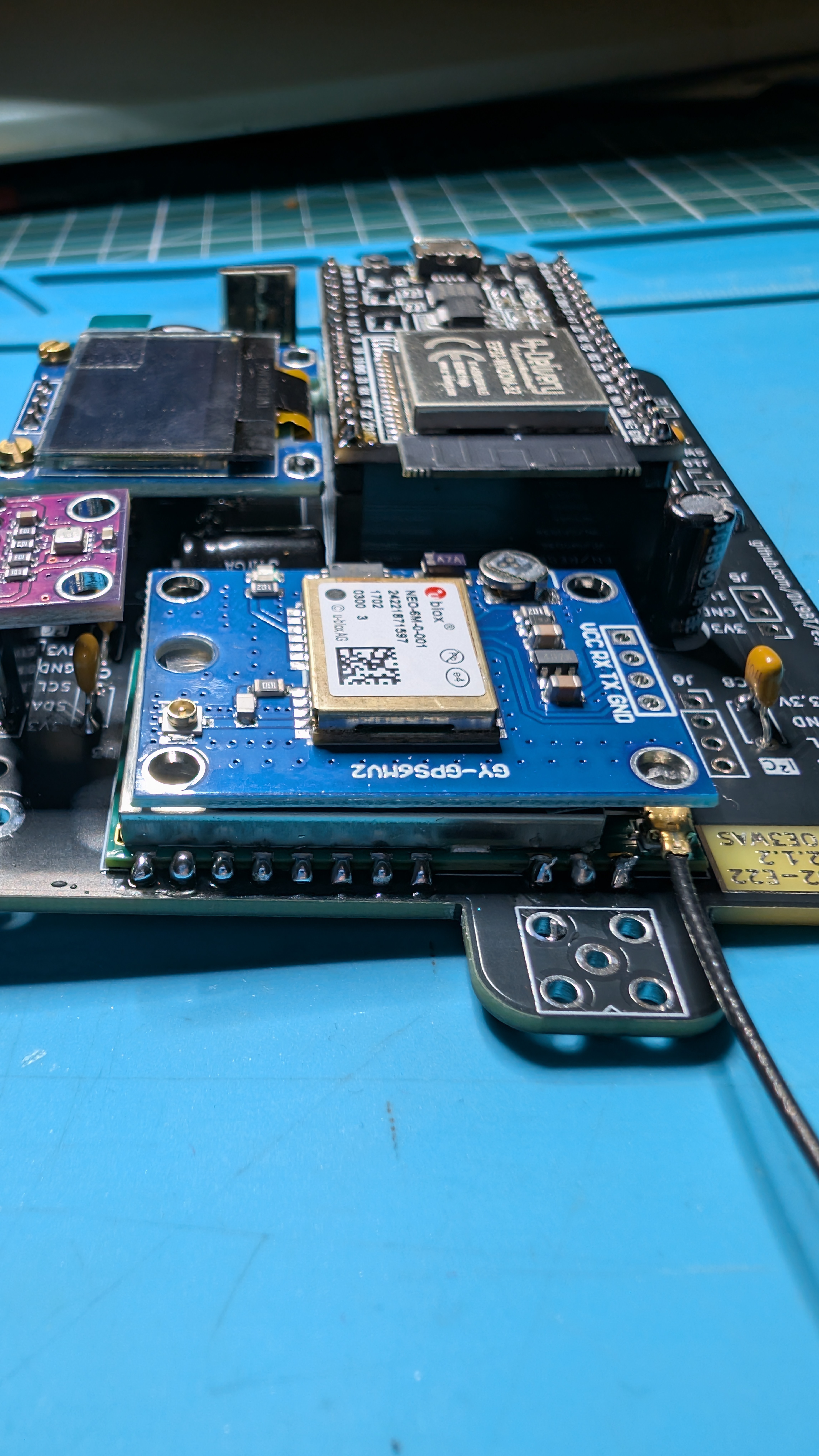 Auf dieser Hochkant-Montage hat die GPS Antenne ihren Platz gefunden. Auch hier hält sie erst mal etwas Tesa-Band fest. Bei einer Quer-Montage würde sie rechts an den Rand kommen, wo jetzt noch der BME380 Baustein steckt.