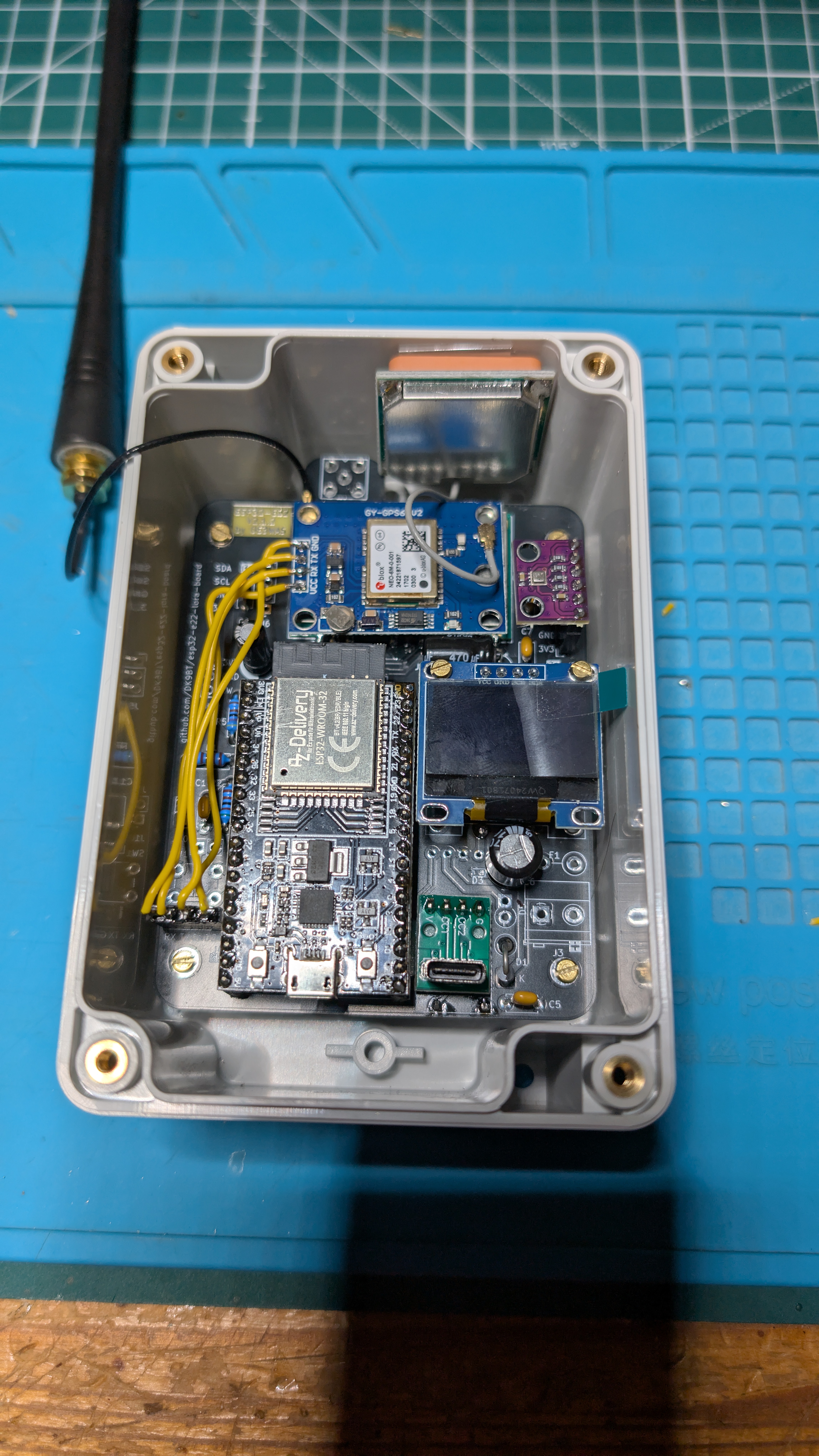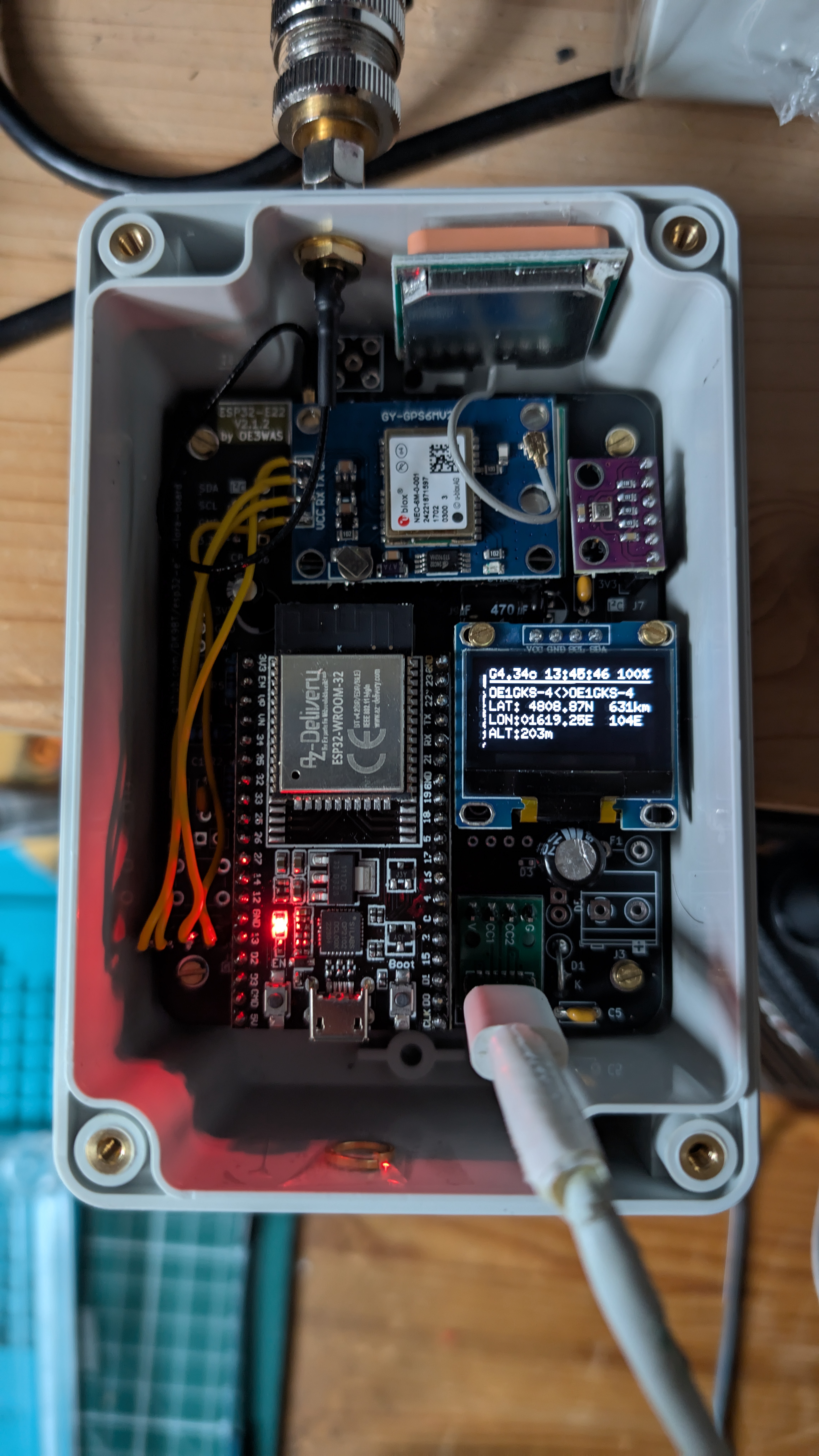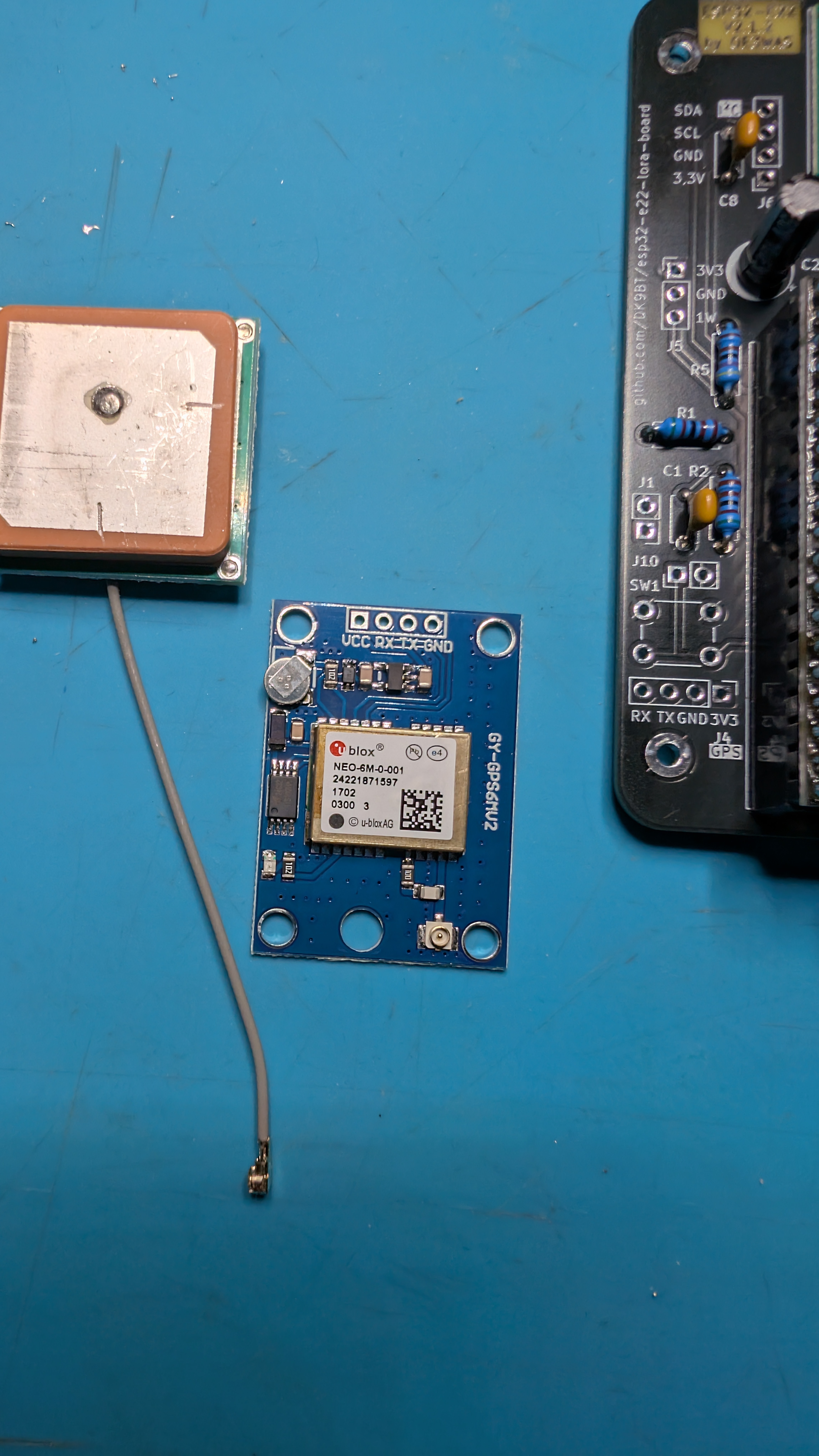 Auf dieser Hochkant-Montage hat die GPS Antenne ihren Platz gefunden. Auch hier hält sie erst mal etwas Tesa-Band fest. Bei einer Quer-Montage würde sie rechts an den Rand kommen, wo jetzt noch der BME380 Baustein steckt.