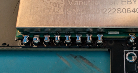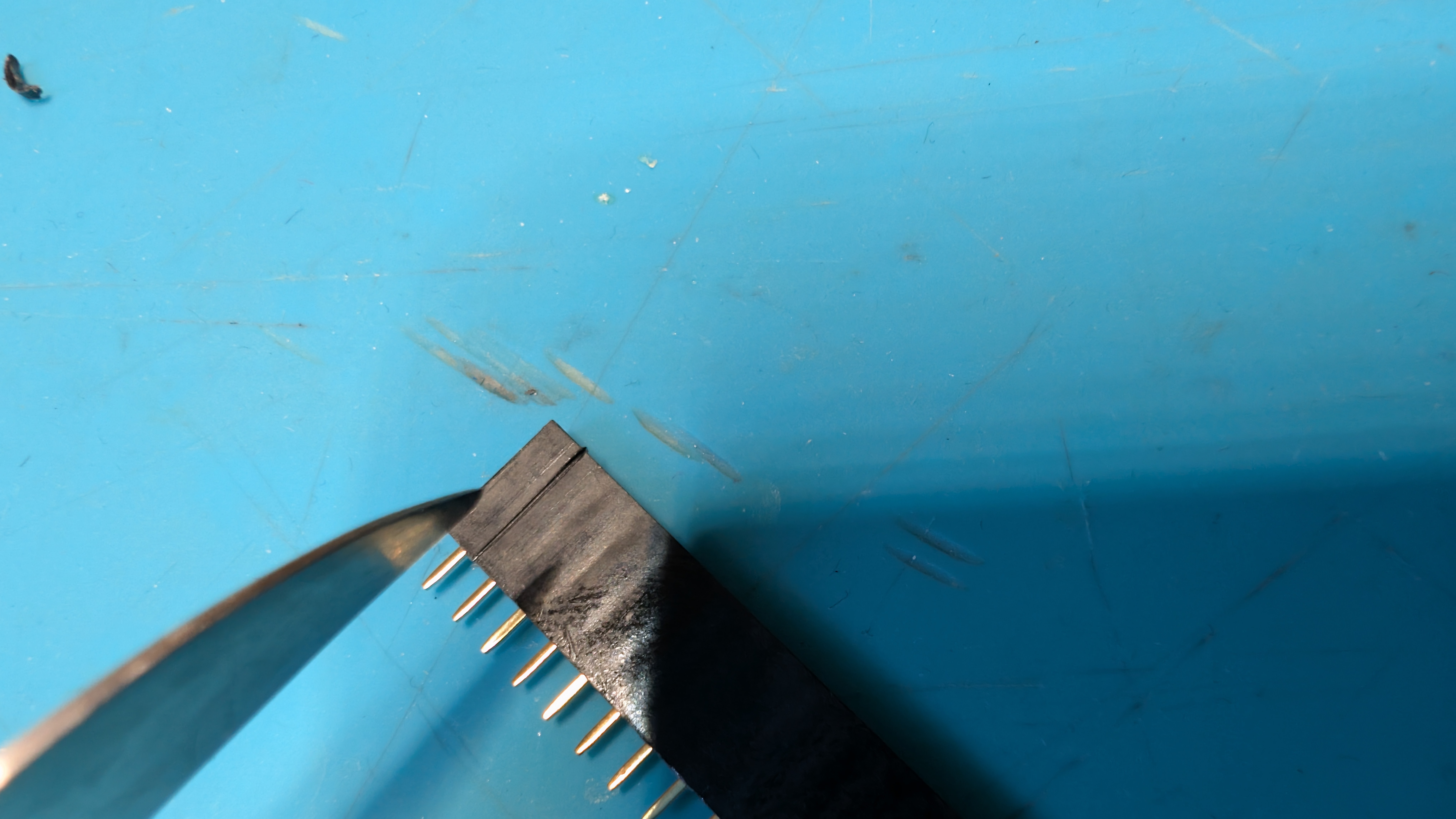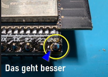 Tipp aus der Praxis: Die GND beschrifteten Pins haben bei mir sehr schwer das Lötzinn aufgenommen. Achtet also gut darauf, dass der Fluss des Lötzinns auf der Platine den ganzen Lötpunkt abdeckt und nicht nur am überstehenden Pin hängt. Sonst mit einem spitzen Gegenstand den Lötbereich freikratzen und etwas Flussmittel auf die Stelle geben. Den Lötkolben nicht zulange draufhalten. Immer wieder eine kurze Abkühlpause einlegen.