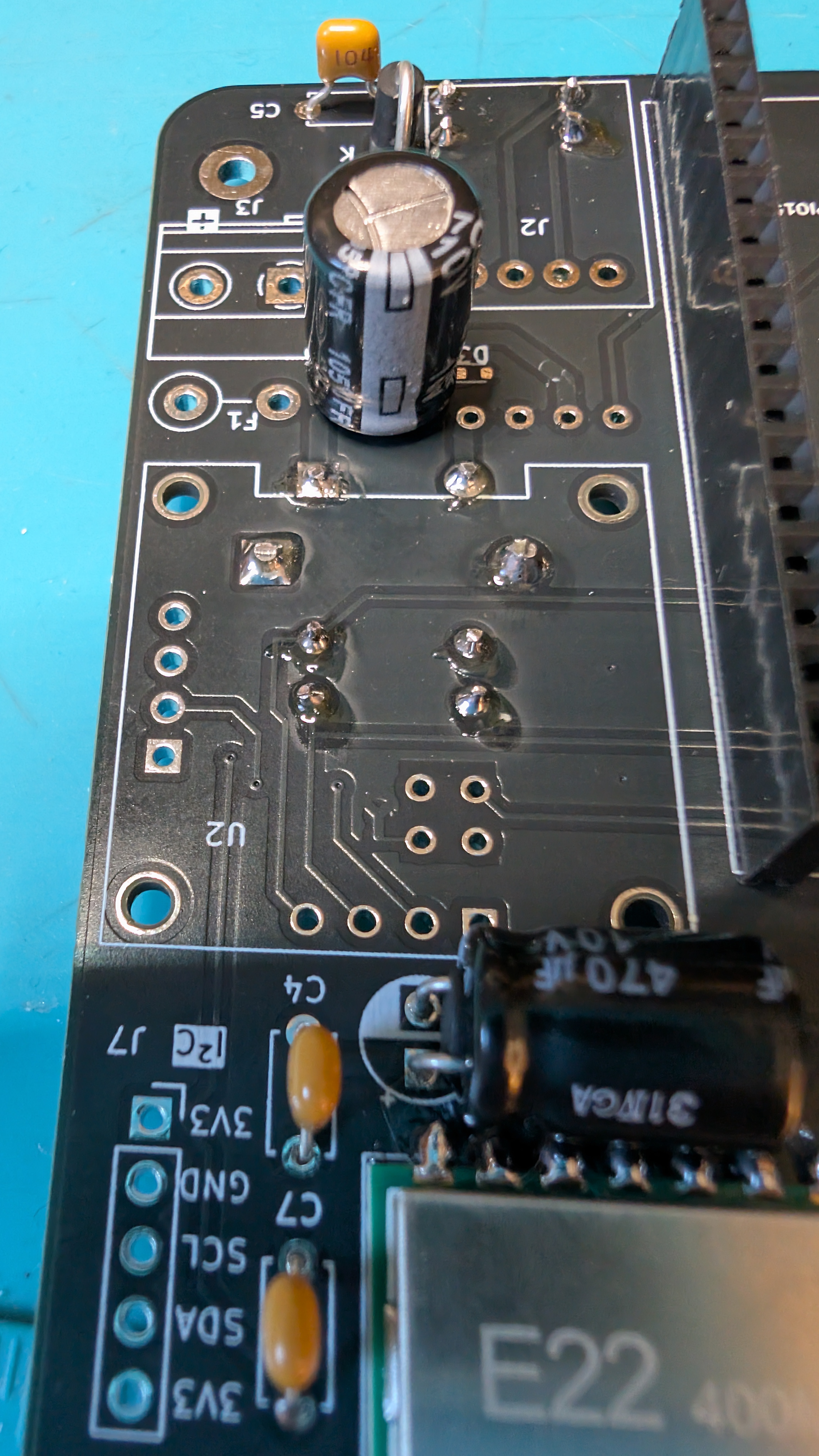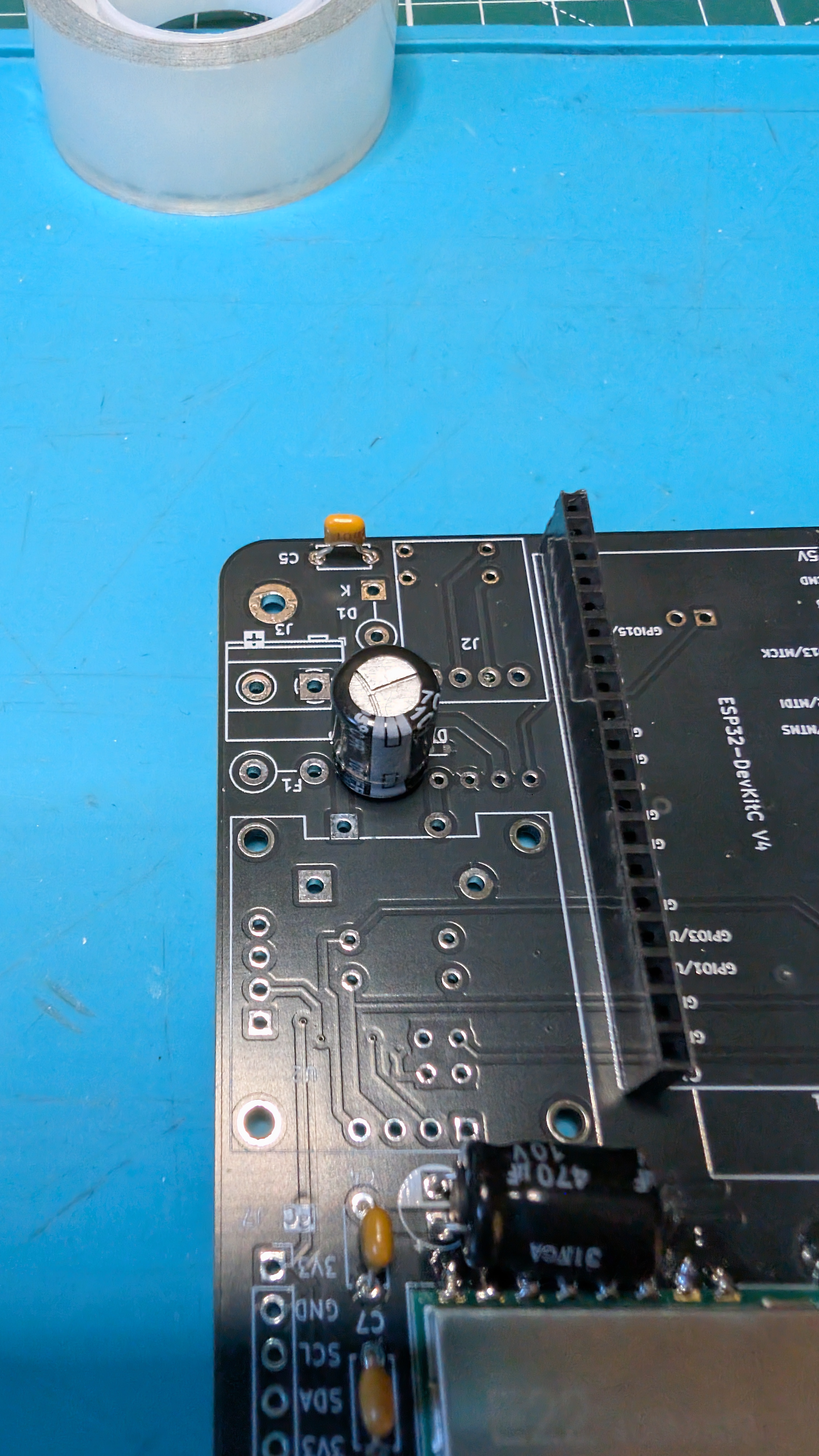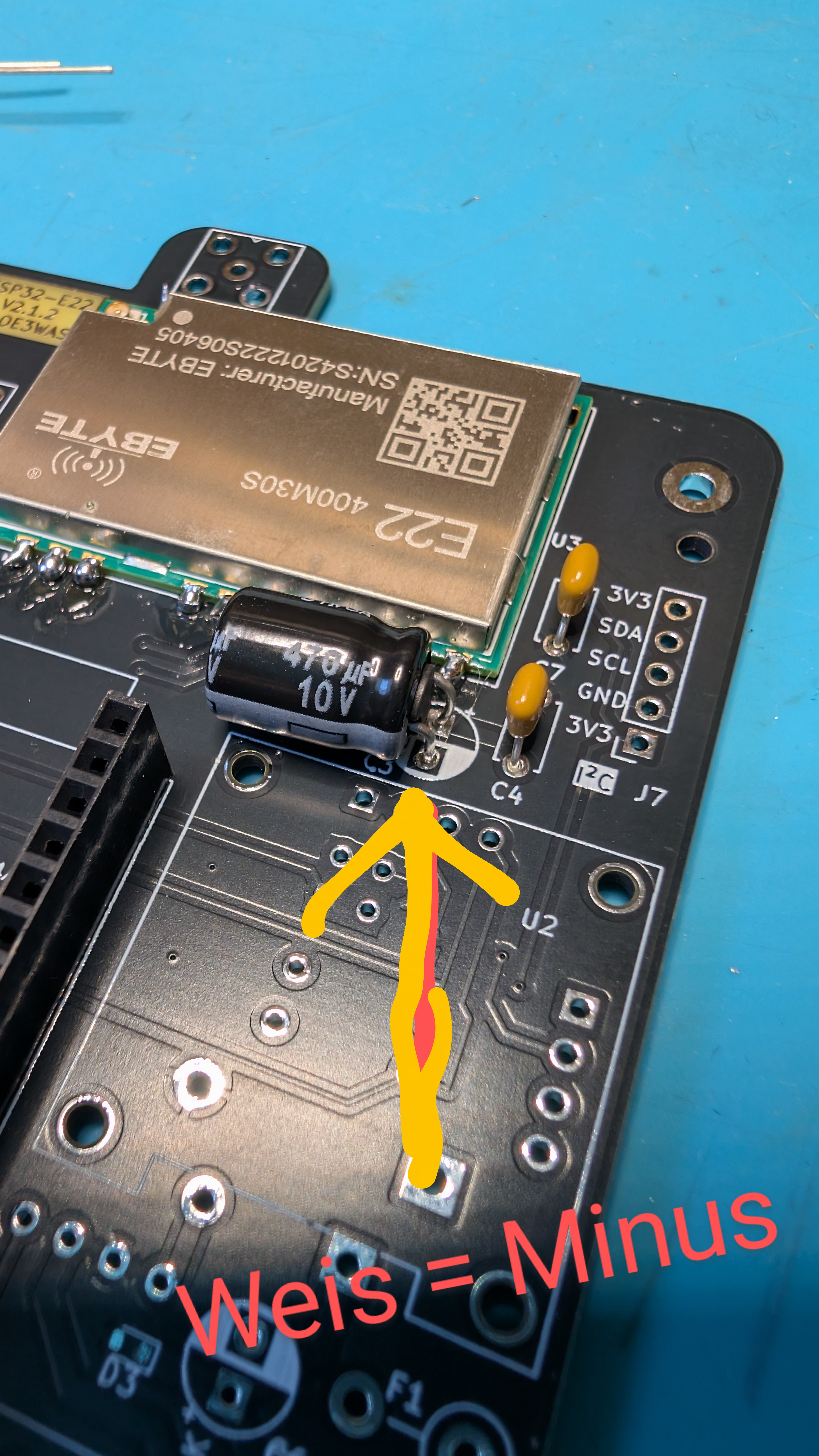 Der zweite 470μF kann stehend eingelötet werden auf der Platine neben dem USB-C Breakoutboard. Sein markierter Kreis ist kleiner als der vom 10μF Kondensator, der oben beim Senderbaustein hin kommt.