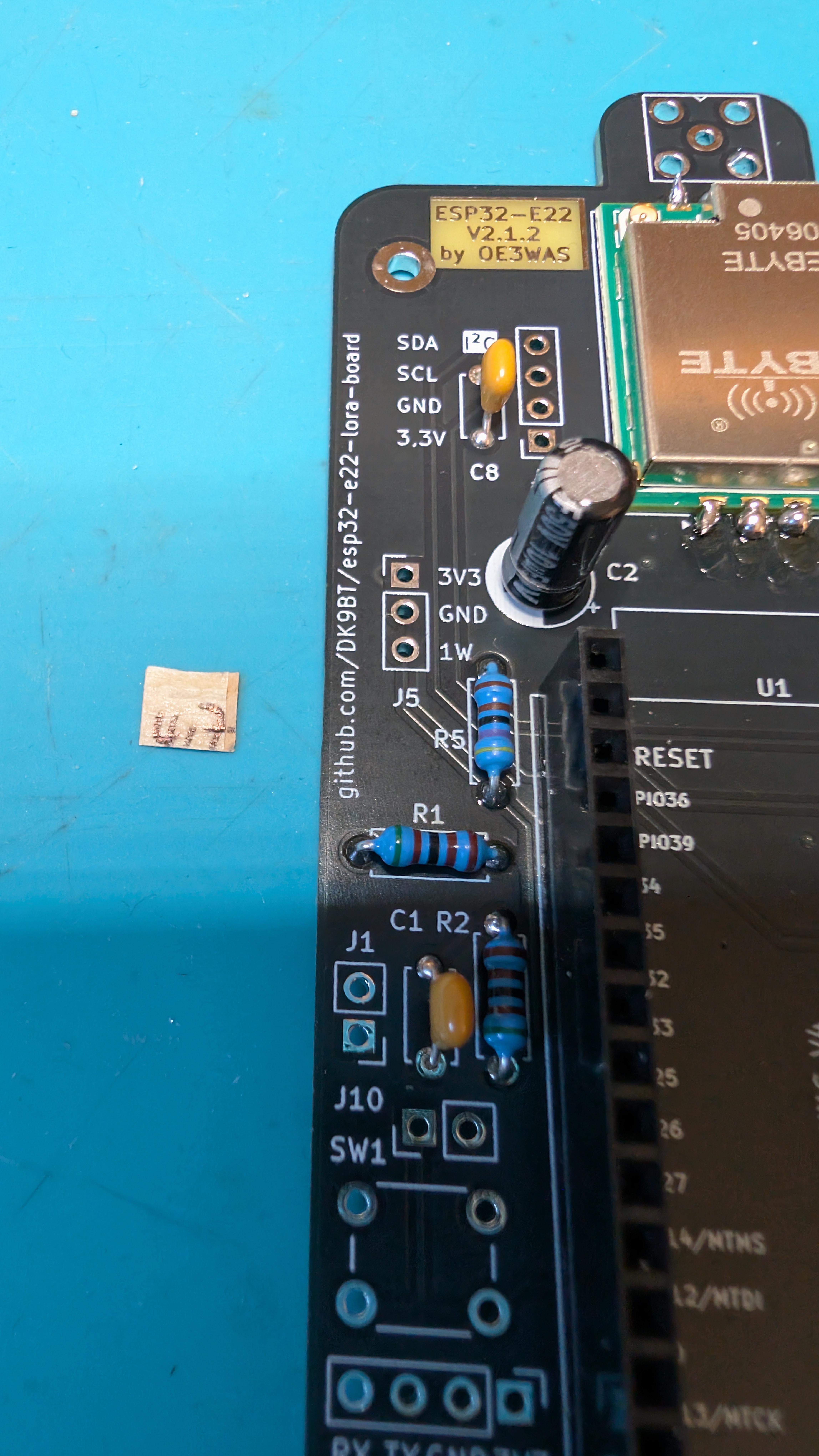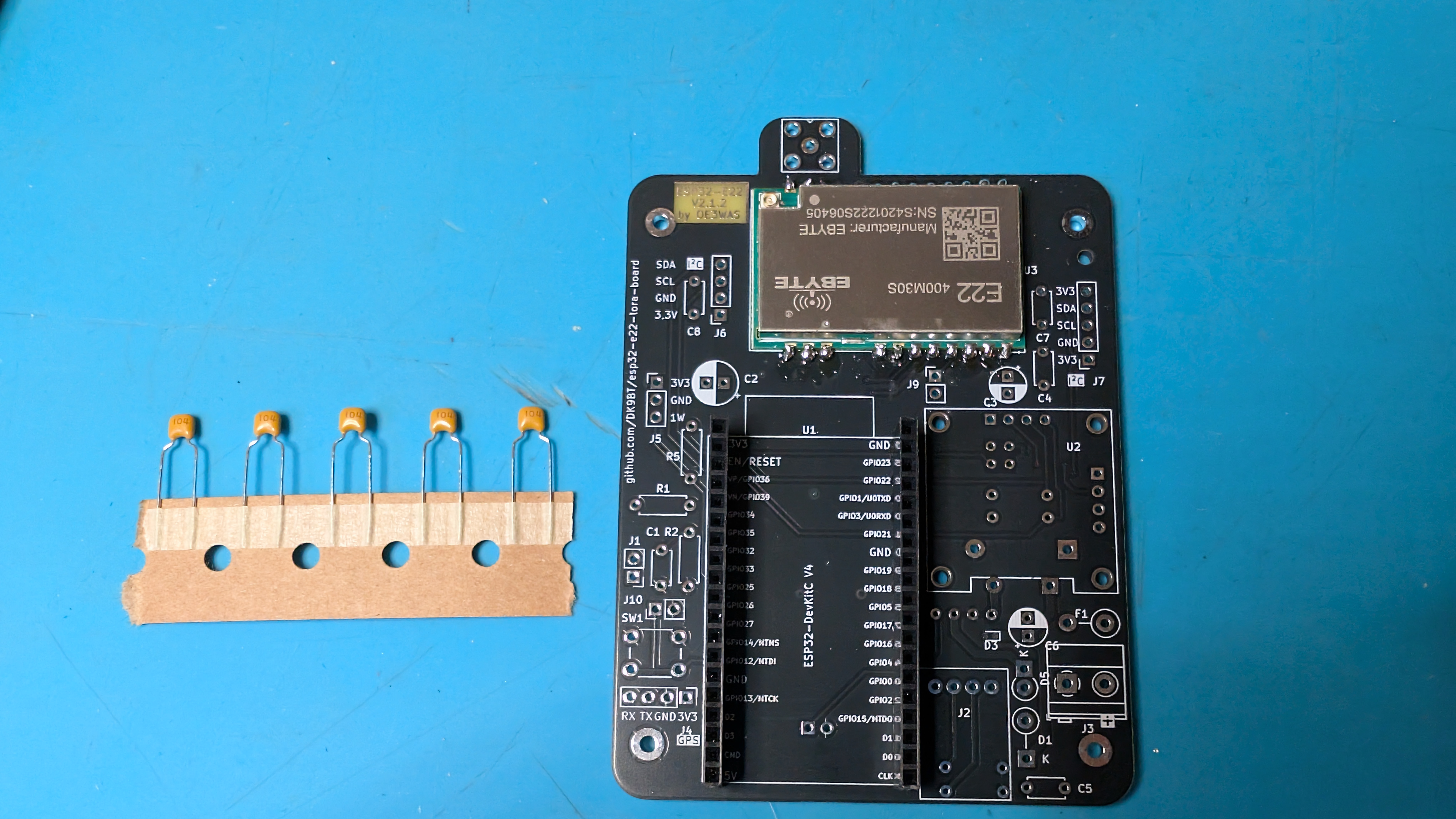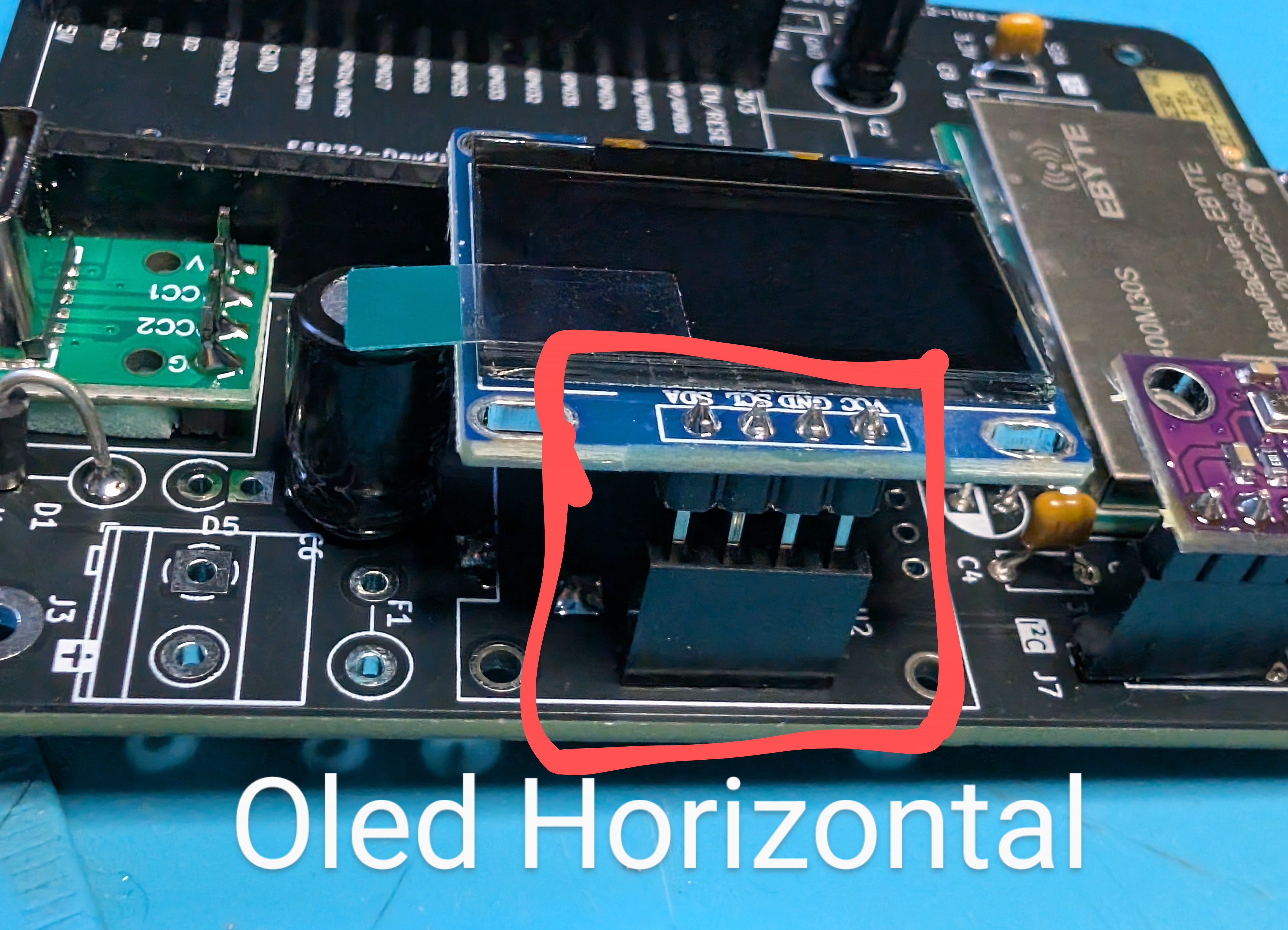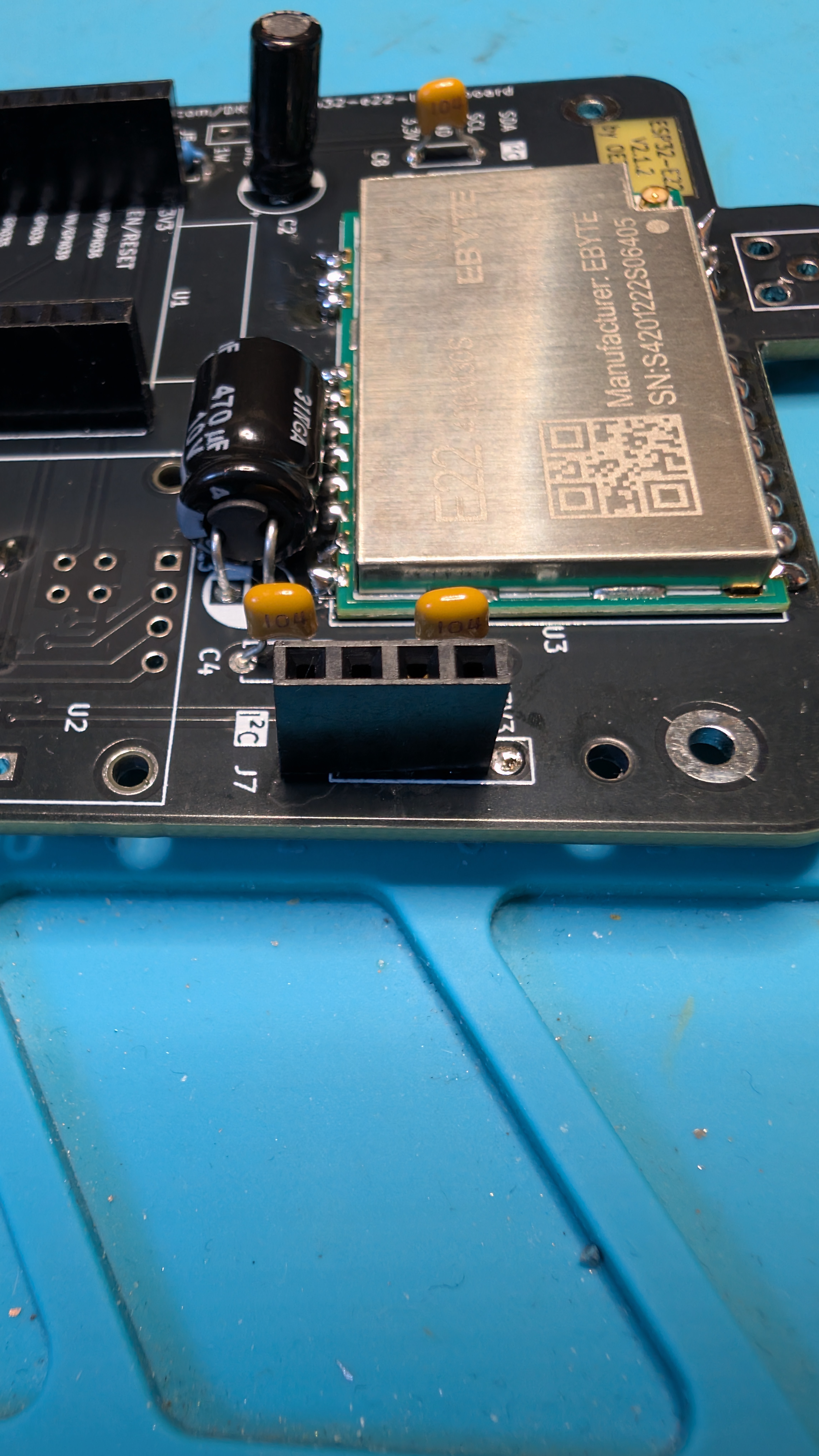 Der zweite 470μF kann stehend eingelötet werden auf der Platine neben dem USB-C Breakoutboard. Sein markierter Kreis ist kleiner als der vom 10μF Kondensator, der oben beim Senderbaustein hin kommt.