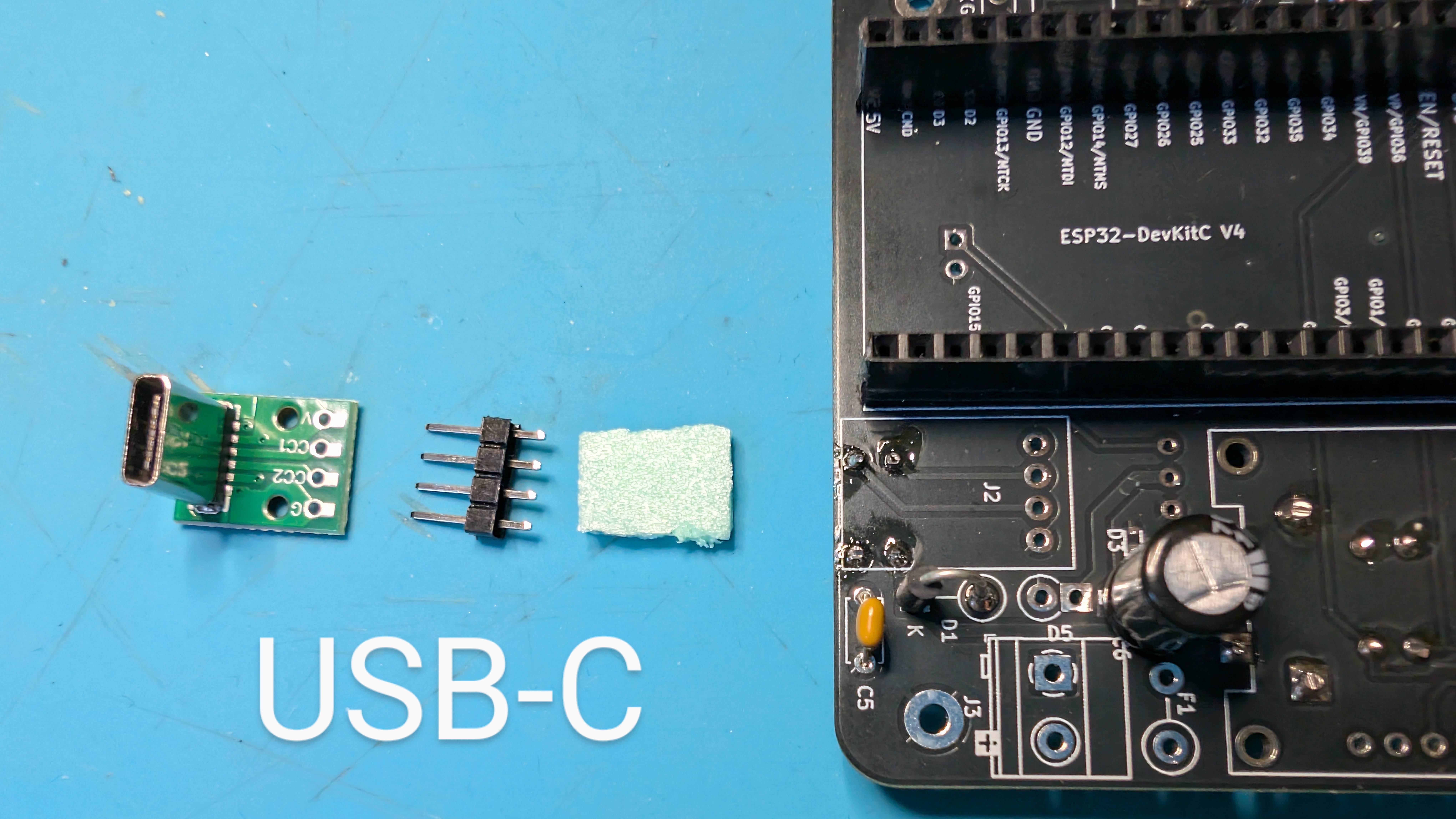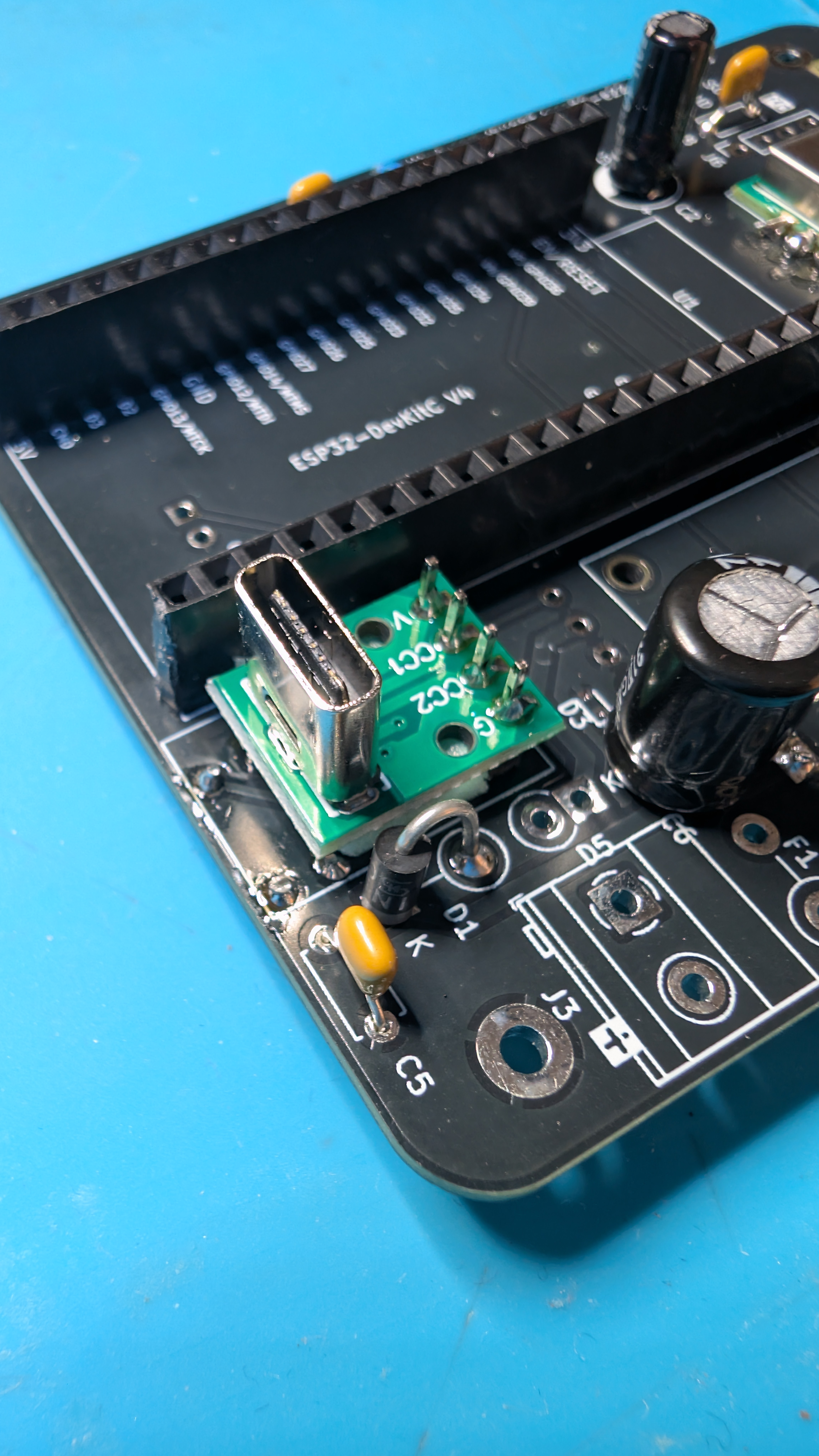 - Die Stromversorgung benötigt eine Quelle, die 5 Volt und 2 Ampere zur Verfügung stellen kann. Die können über den MicroController ESP32 und seiner MicroUSB Buchse und über das jetzt von dir zu montierende USB-C Breakout Board eingespeist werden. Optional: auch über die nicht enthaltene DC-DC Regelung mit Anschraubbuchse. Alle Eingänge sind gleichberechtigt und gegenseitig über Shottky-Dioden geschützt.