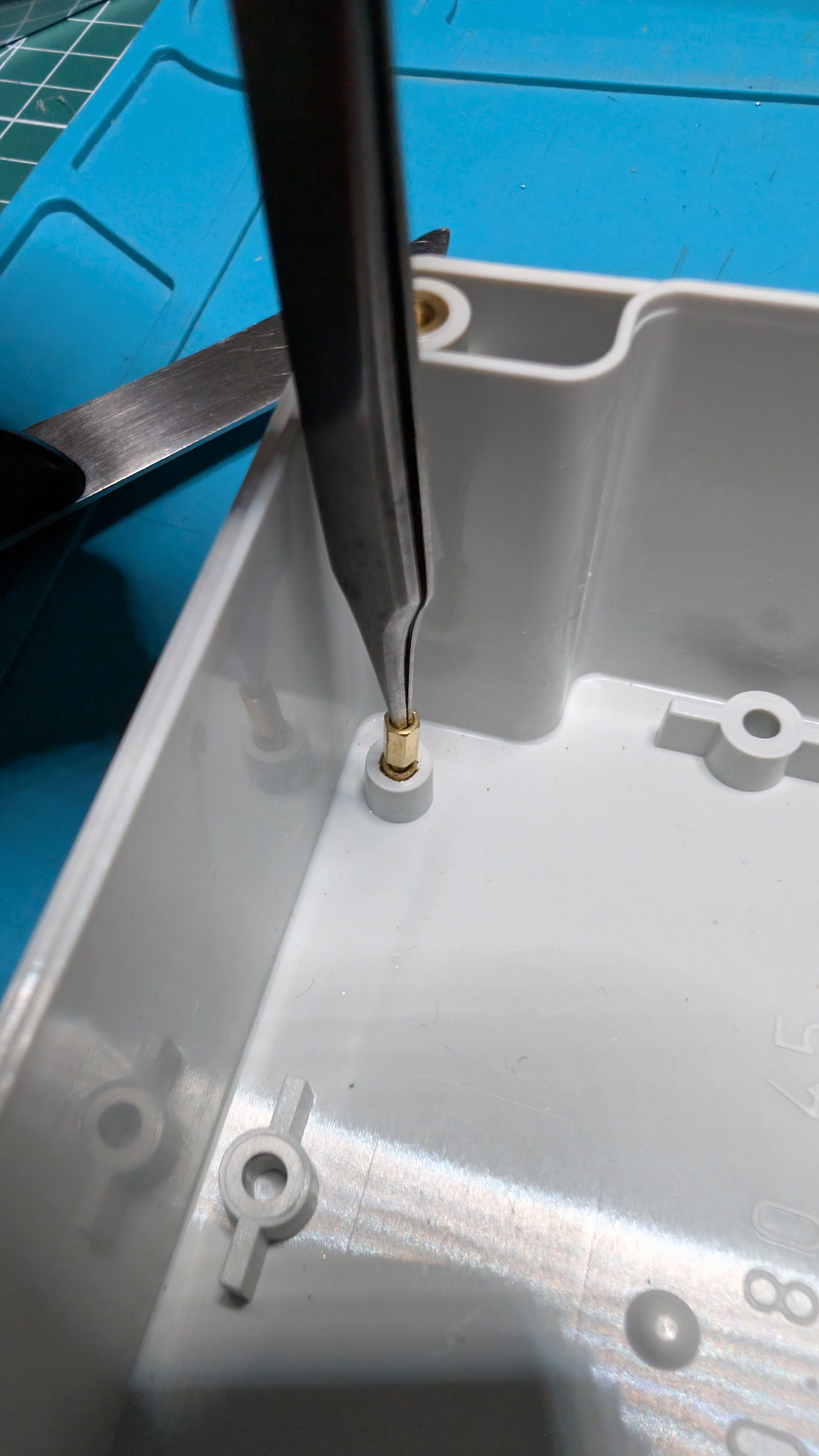 Nun die Platine in das Gehäuse einlegen und die Löcher der Ecken prüfen ob der Bolzen darunter sauber passt.