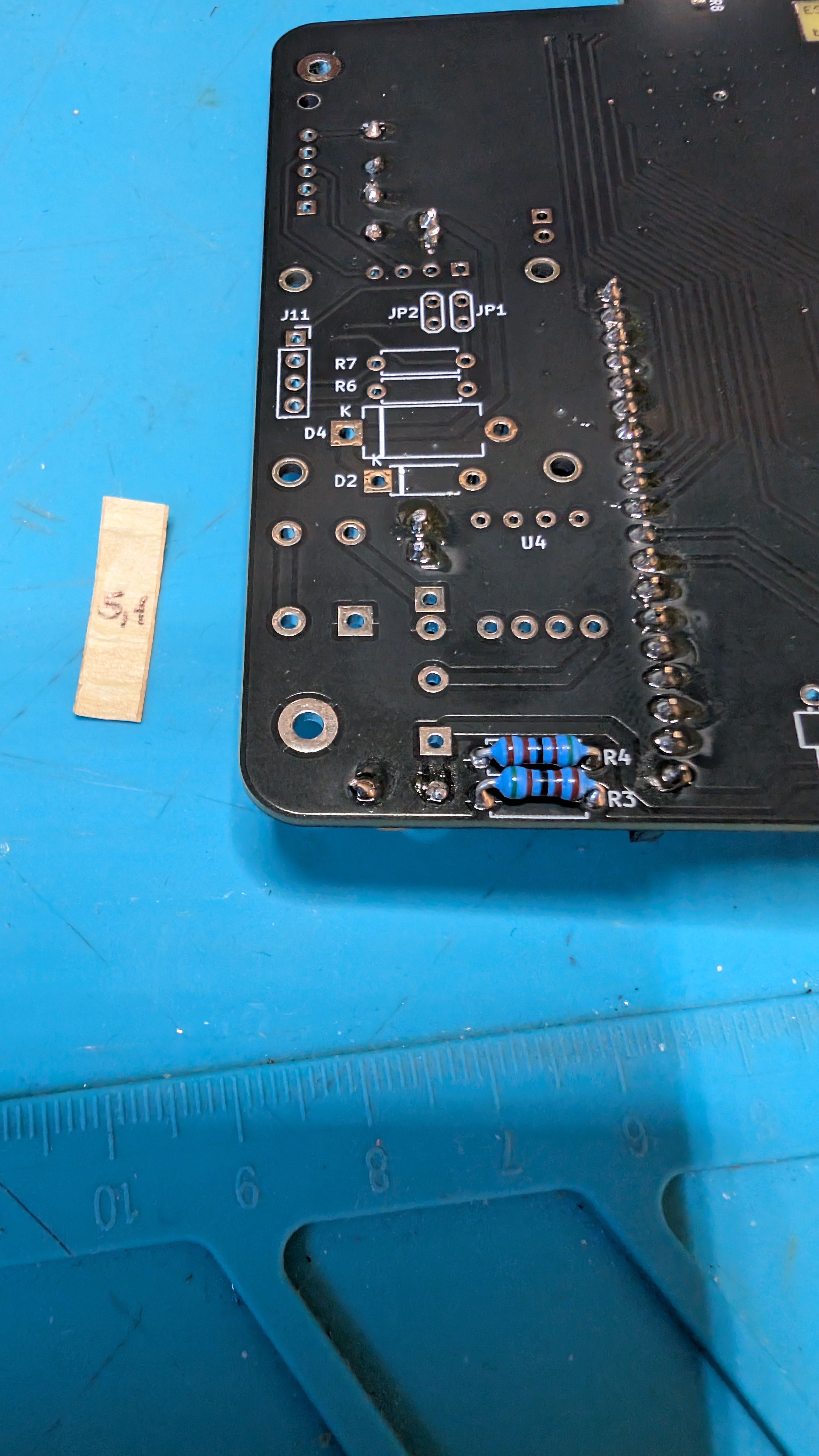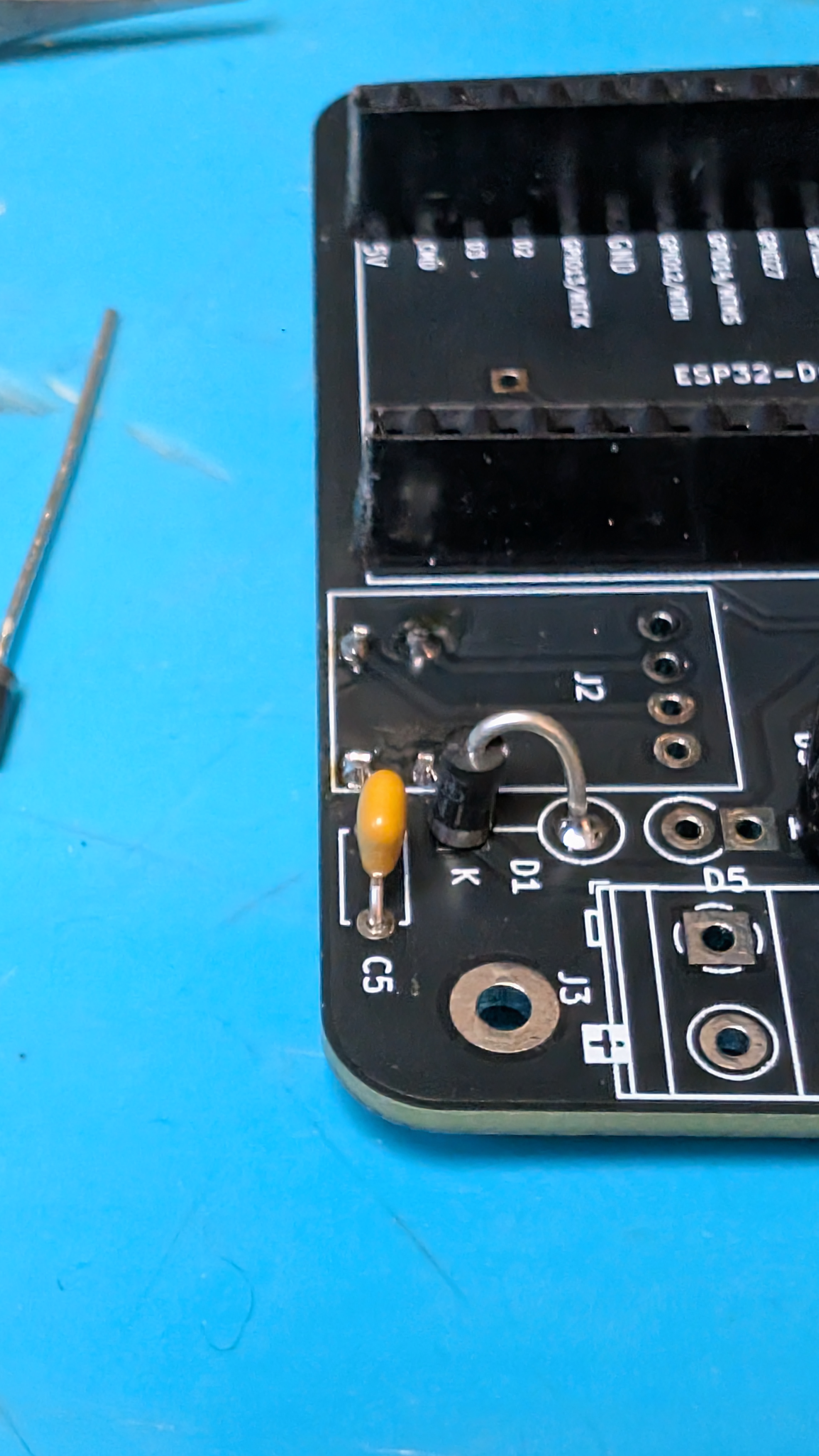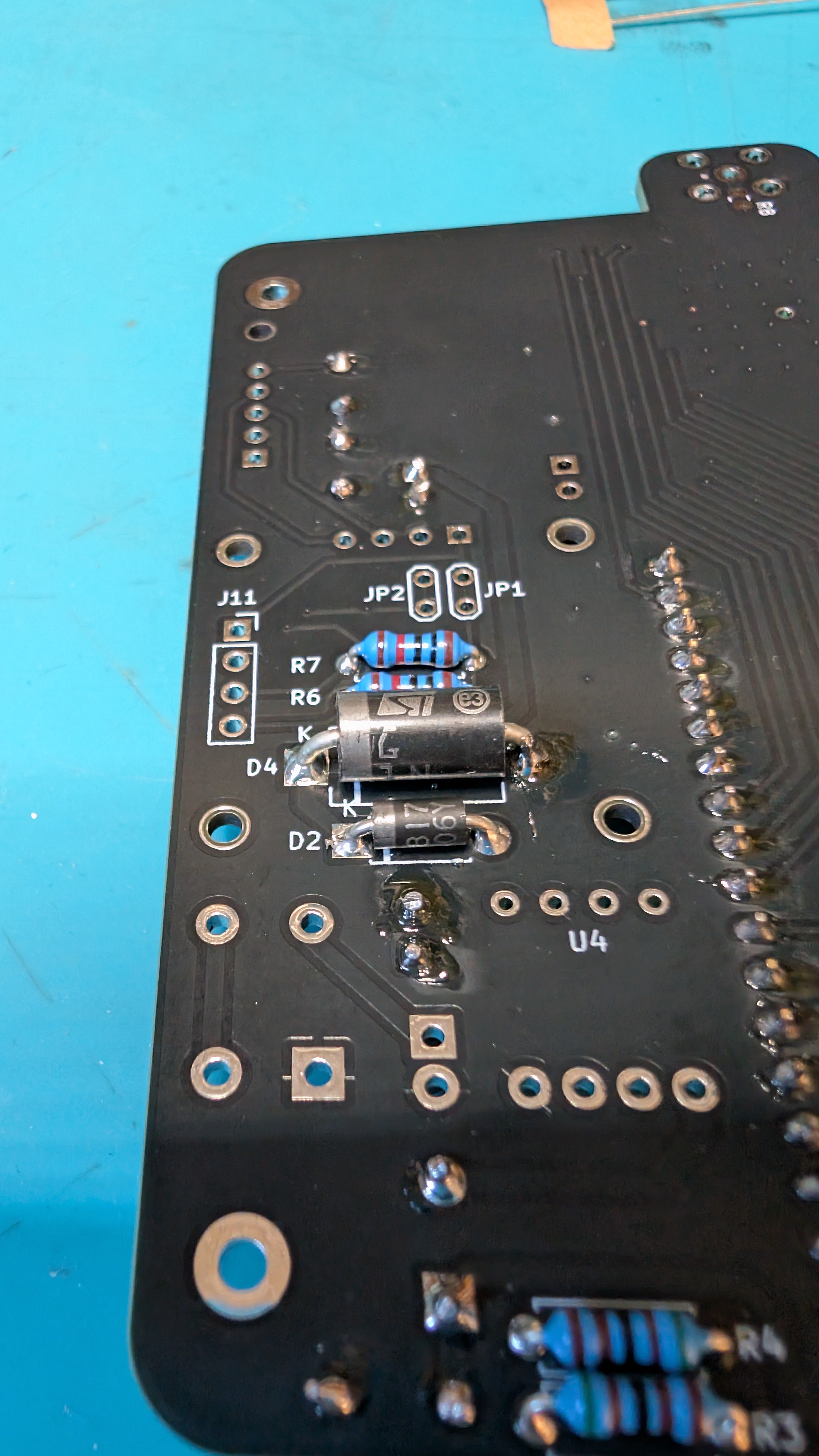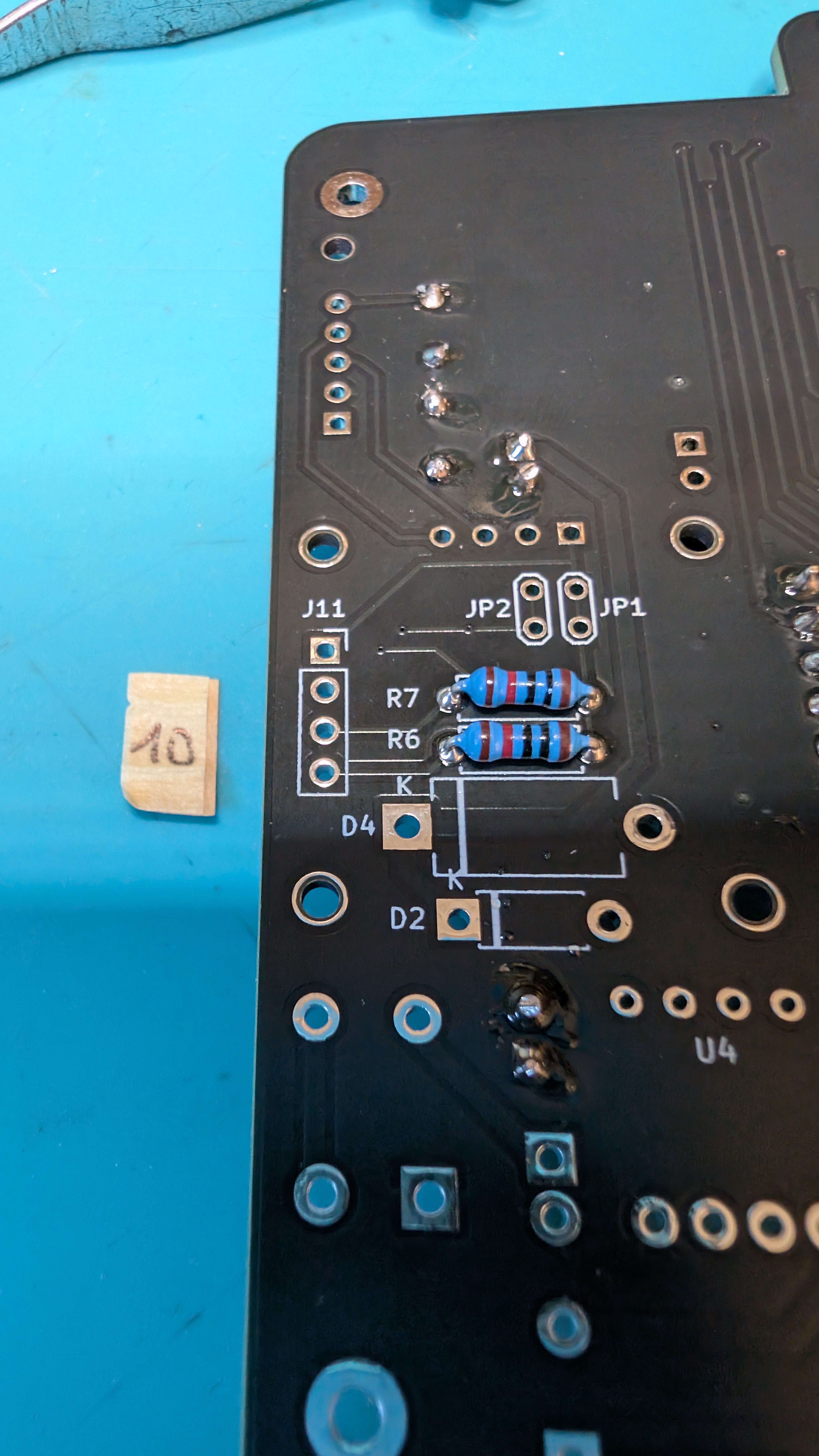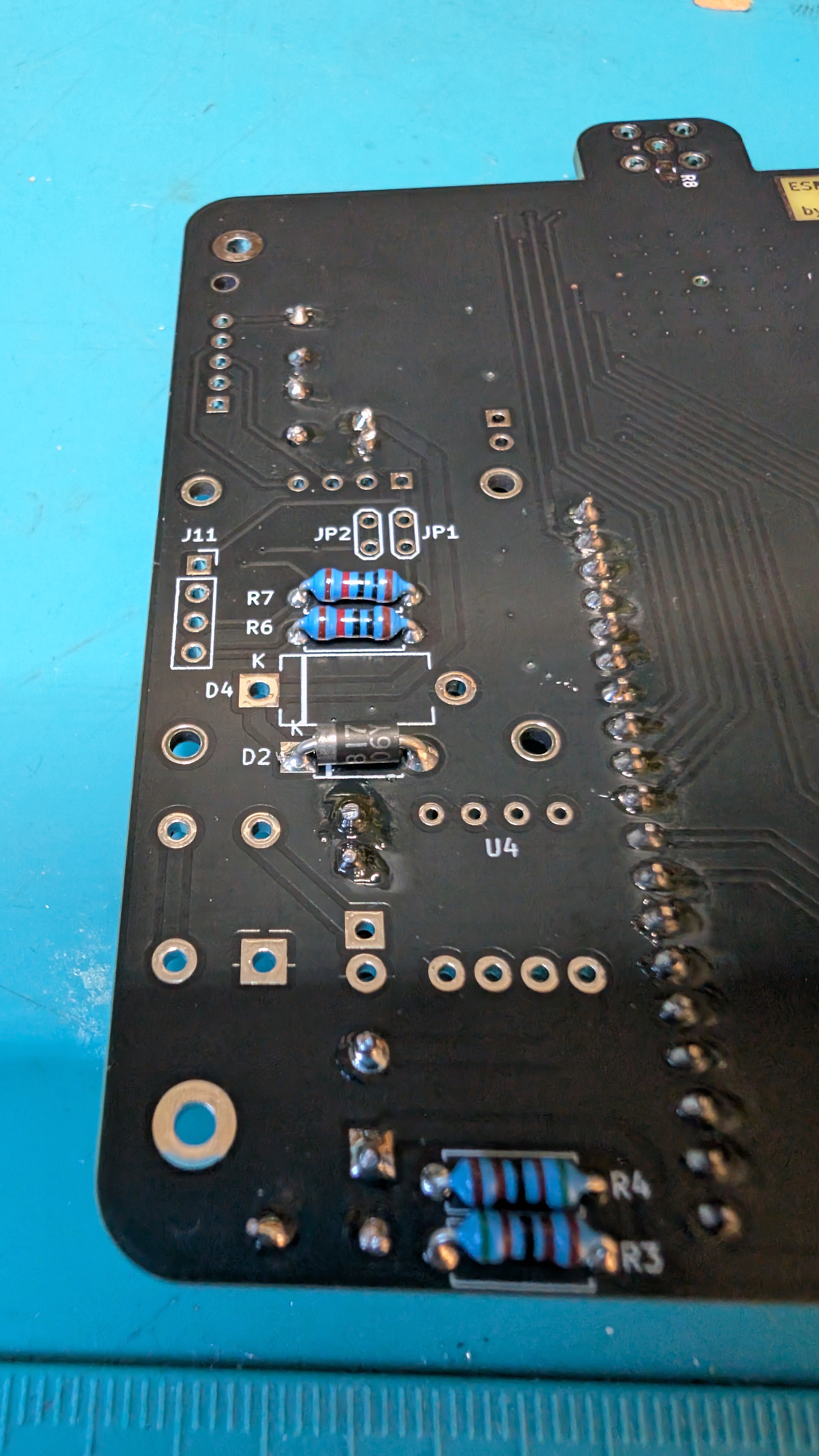 Diese hier bitte stehend einlöten. Die D5 daneben ist optional und nicht dabei. Zusammen mit der fehlenden Anschraub-Buchse und noch einem DC-DC-Regler-Baustein, kann man das Gerät aufrüsten bis zu einer Betriebsspannung von 24 Volt.