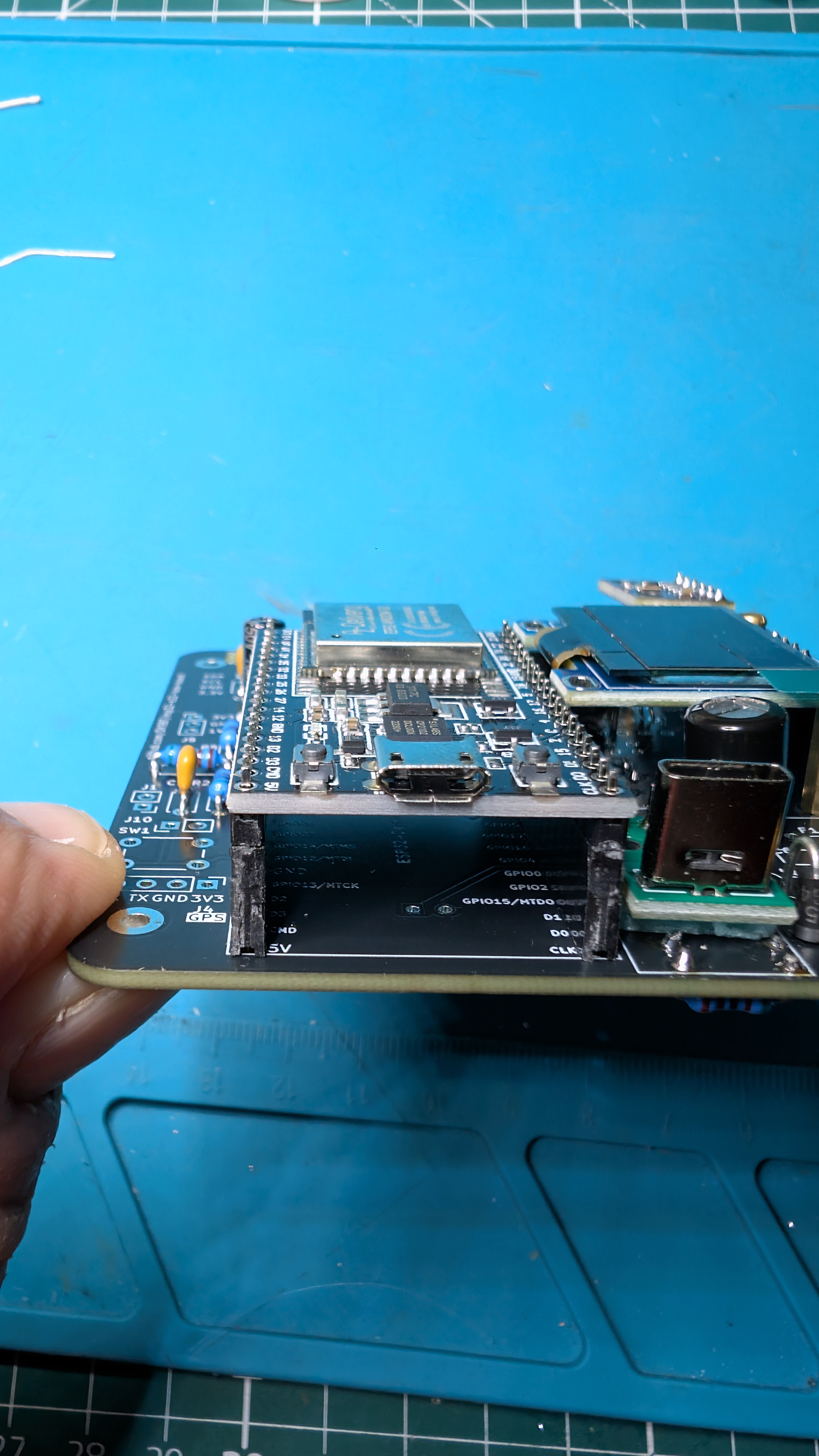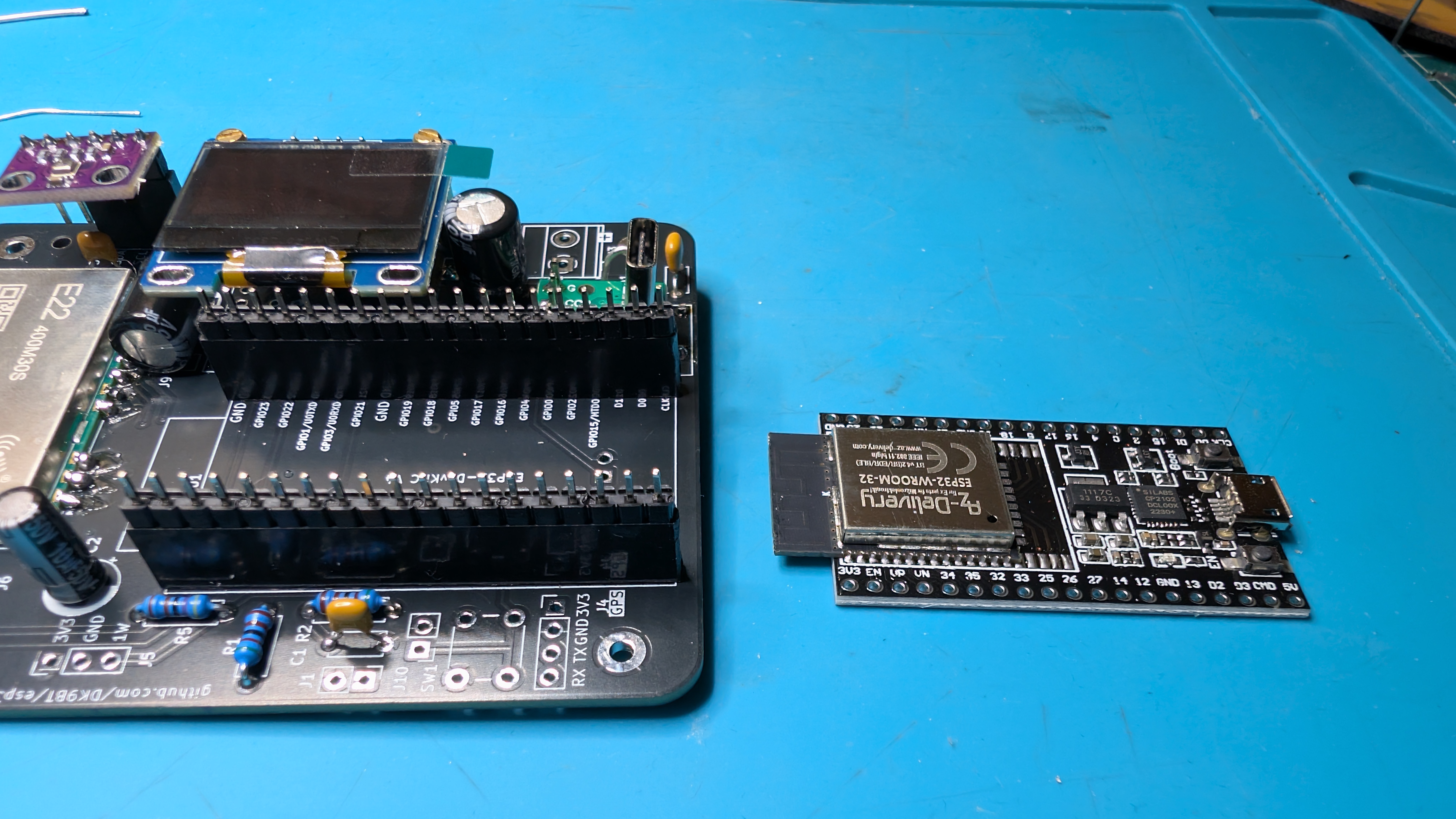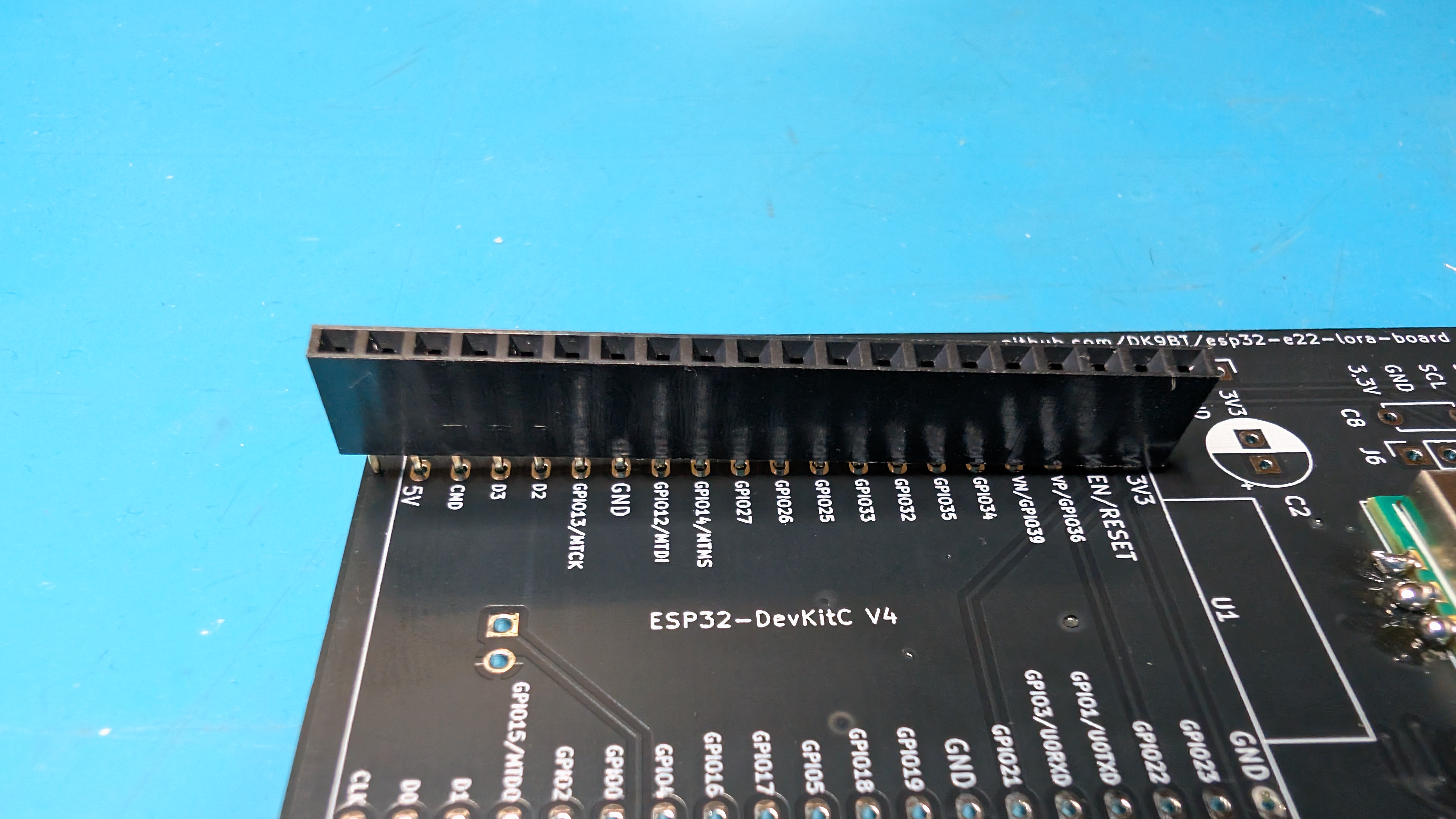 Die Buchsenleisten haben wir ja schon auf der Platine befestigt. Nun muss du noch die Pin-Leisten auf dem ESP-Board anlöten.