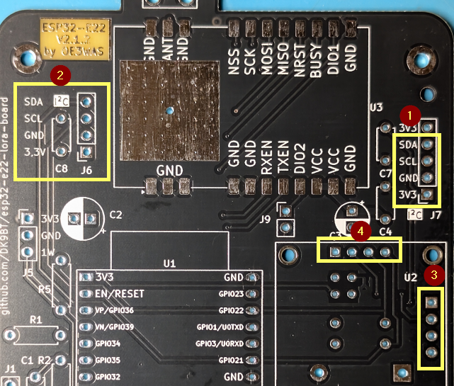Der BME280 kann rechts oben (1) bei J7 aufgesteckt werden. Willst du jedoch das Gehäuse quer benutzen (Platine im Geiste 90 Grad nach links drehen), sollte hier der Platz für die GPS-Antenne nicht zugebaut werden. Bei Querbetrieb also darüber nachdenken besser den Punkt (2) - links vom Sendebaustein zu nutzen (J6).