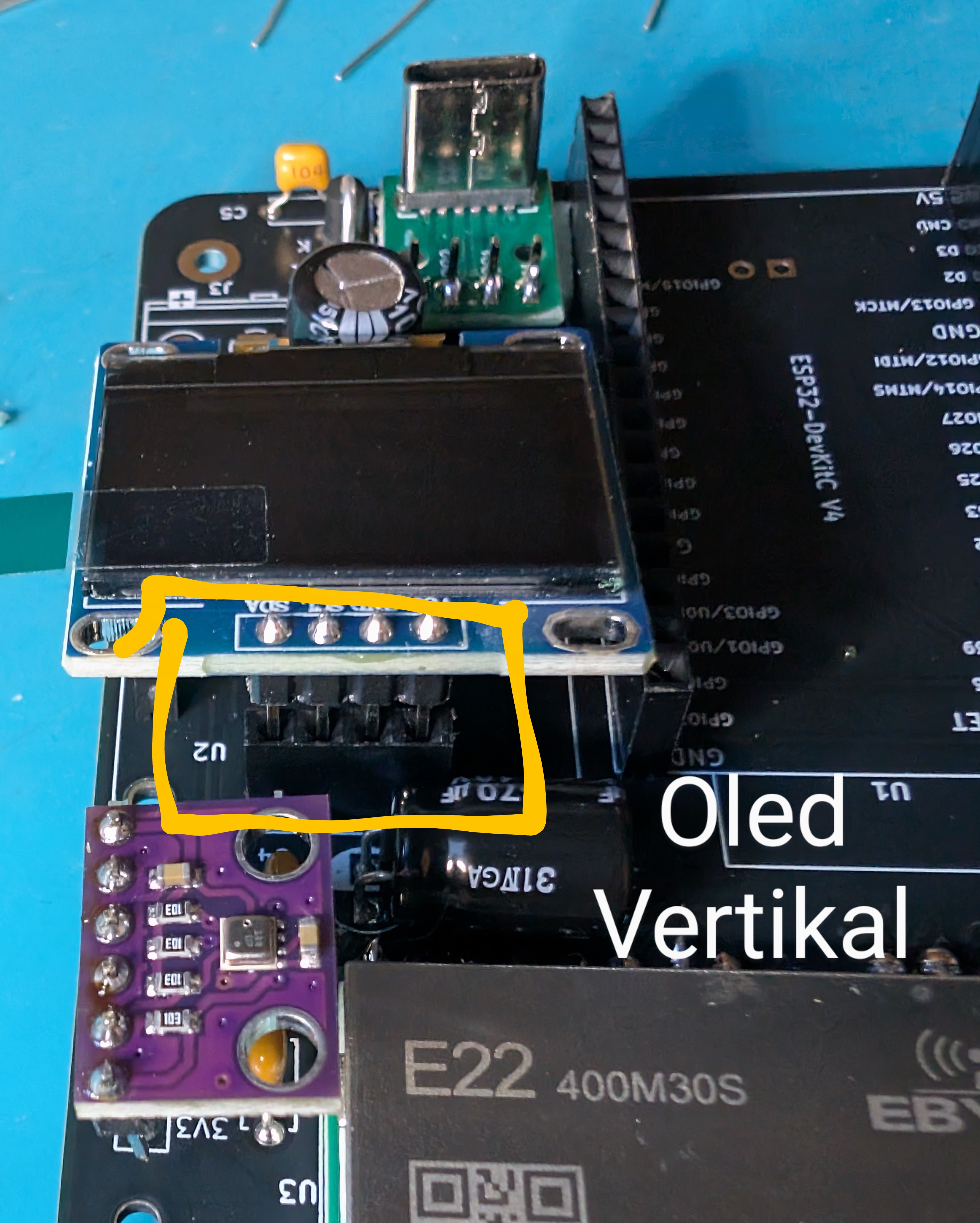 Im **Querbetrieb** ist für sie nur dann Platz, wenn wir den BME-280 nicht rechts oben, sondern woanders untergebracht haben. Also auch keine Pin-Buchsenleiste am Punkt 1 eingelötet wurde.