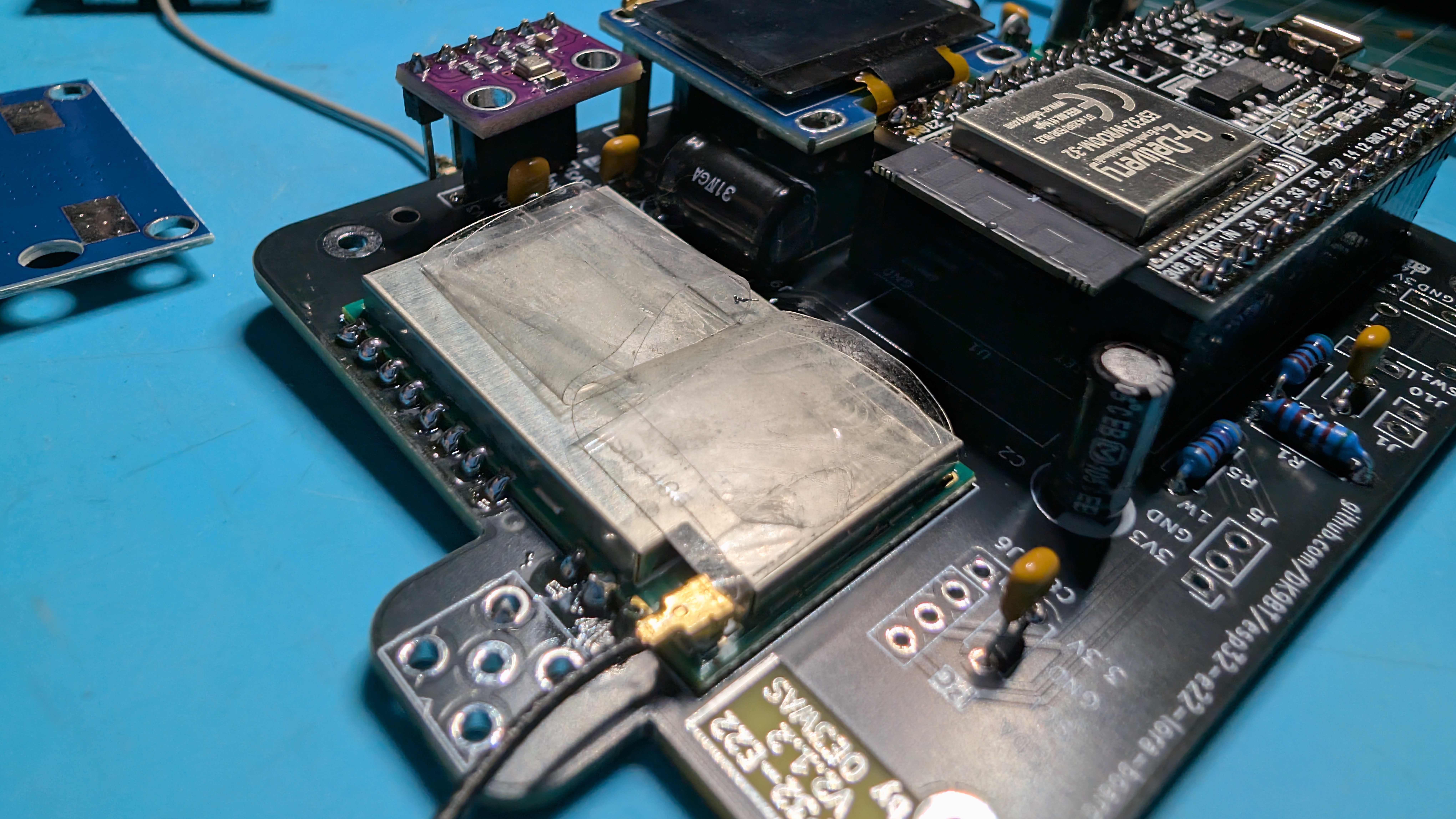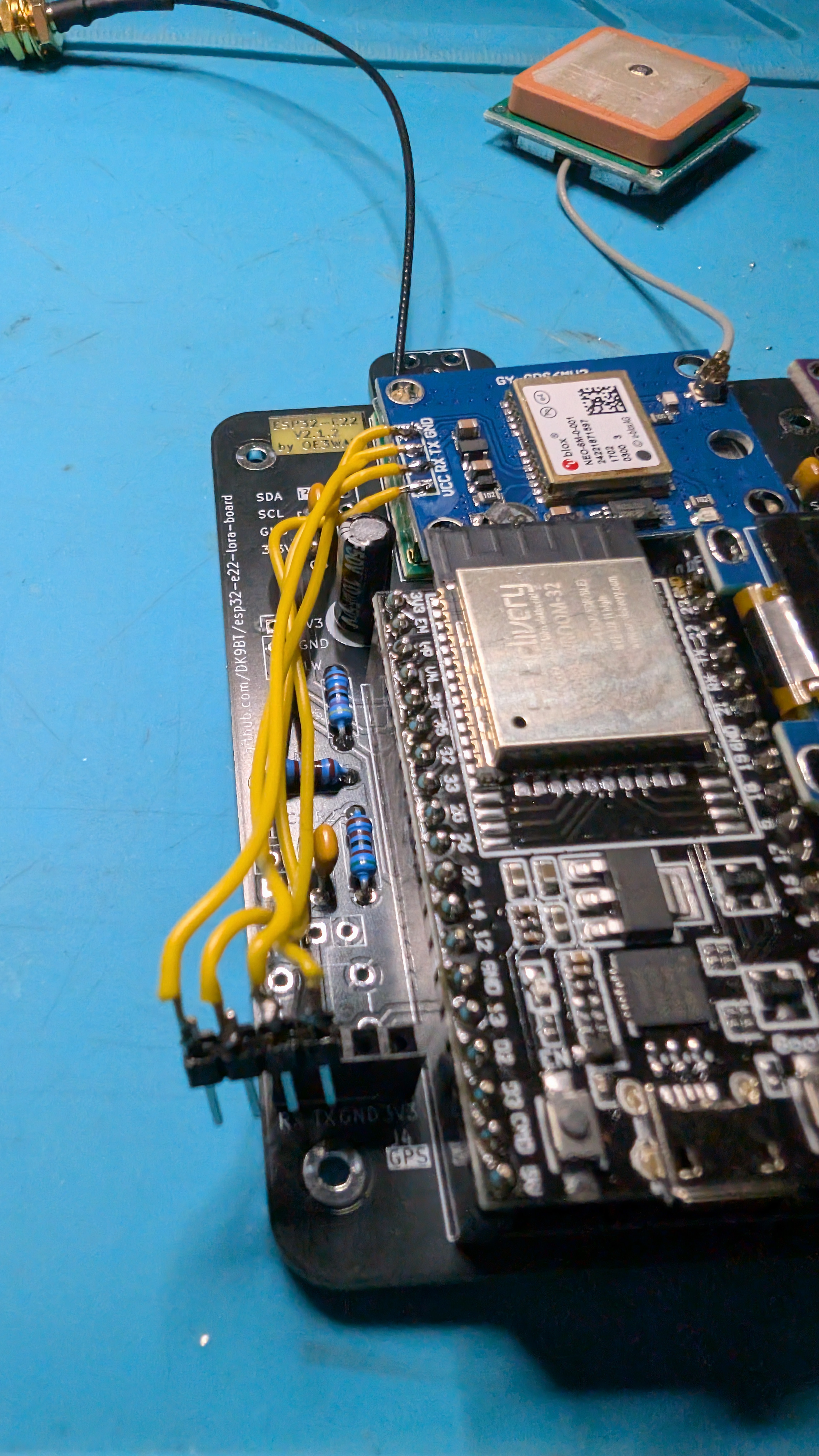 Fangen wir an. Die Platine dazu habe ich auf den E22-Sendebaustein mit zwei Tesa-Röllchen geklebt,die das ganze Blech des Senders bedecken. So kommt später noch etwas Luft dawischen aber es gibt keinen Kurzschluss auf dem GPS-Board.