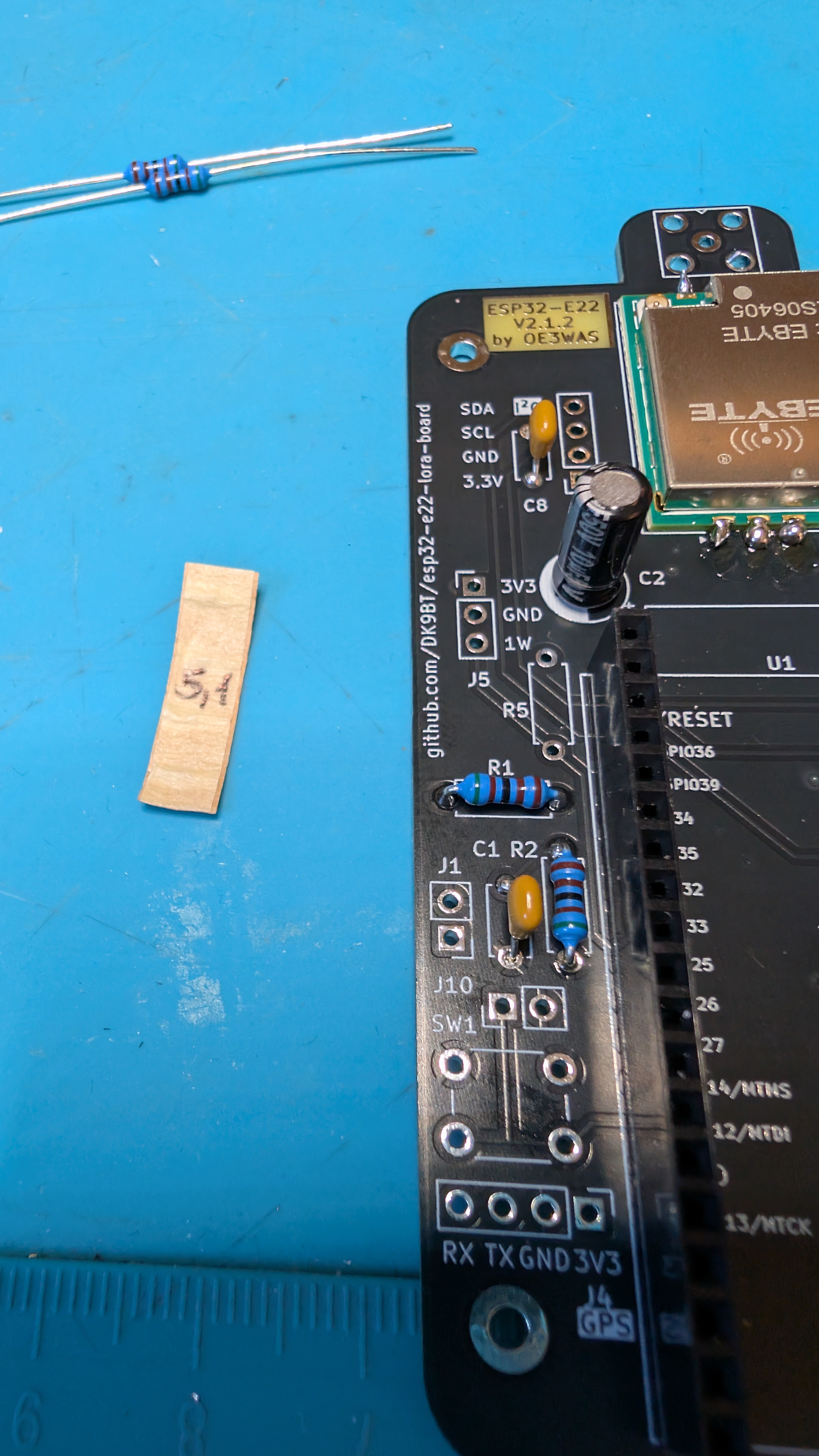 **NICHT JETZT EINLÖTEN:** Der Widerstand R5 (4,7 kOhm) ist dabei, es wird aber empfohlen ihn erst dann einzusetzen, wenn man auch etwas an dem *OneWire Anschluss* (J5) betreiben will und der betroffene Sensor keinen eigenen Widerstand mitbringt. Hat der Sensor bereits einen Widerstand mit drauf, würden beide parallel liegen und die Werte verfälschen.